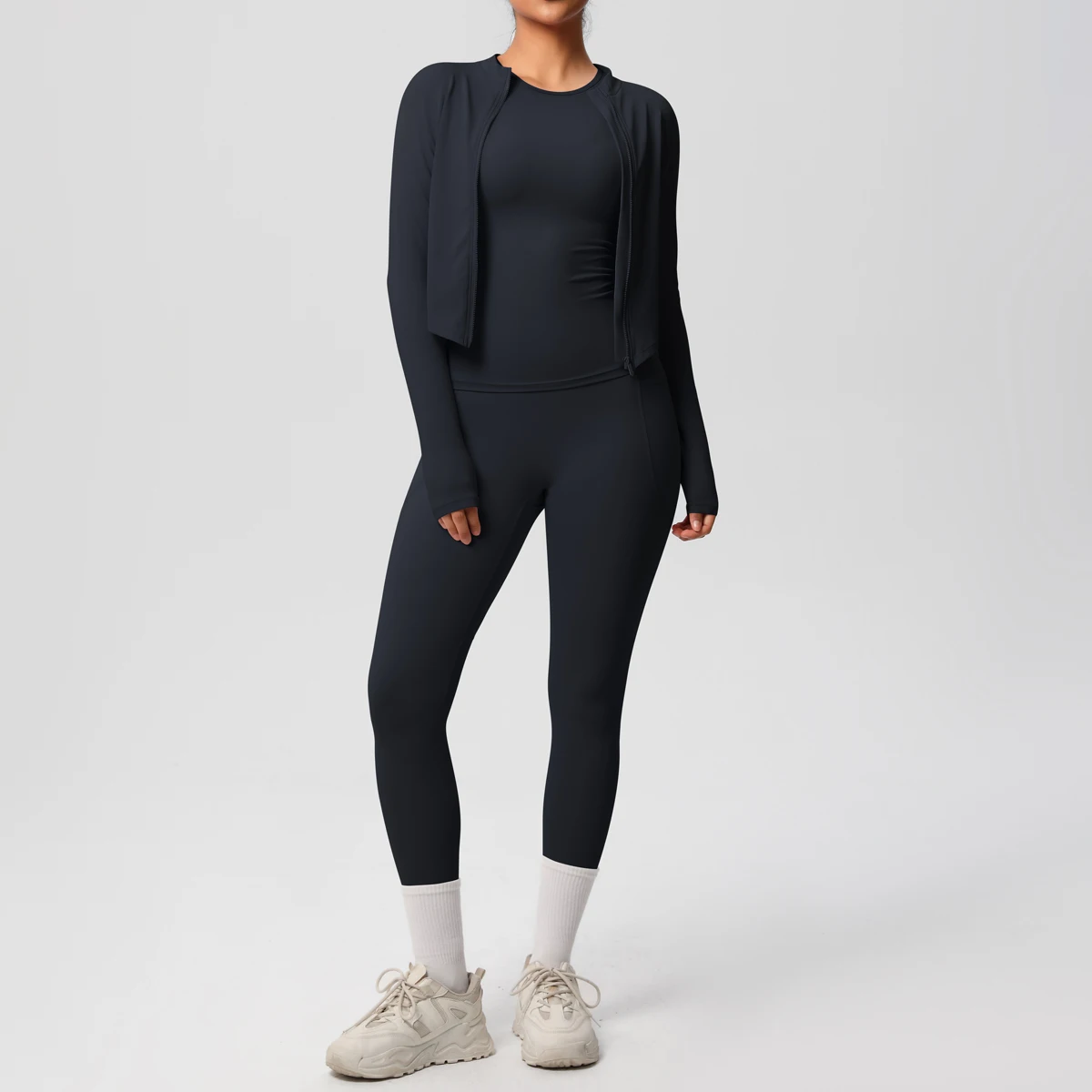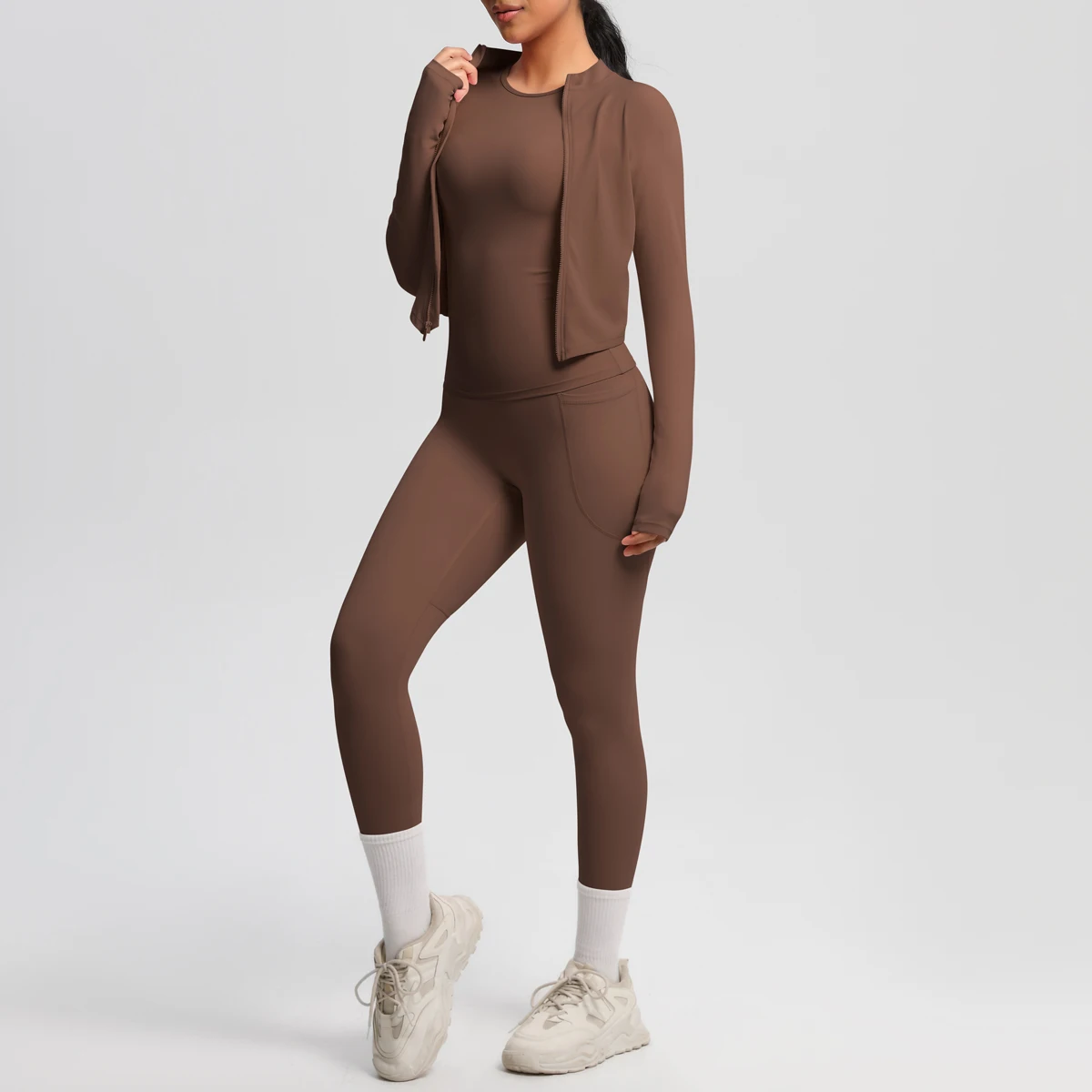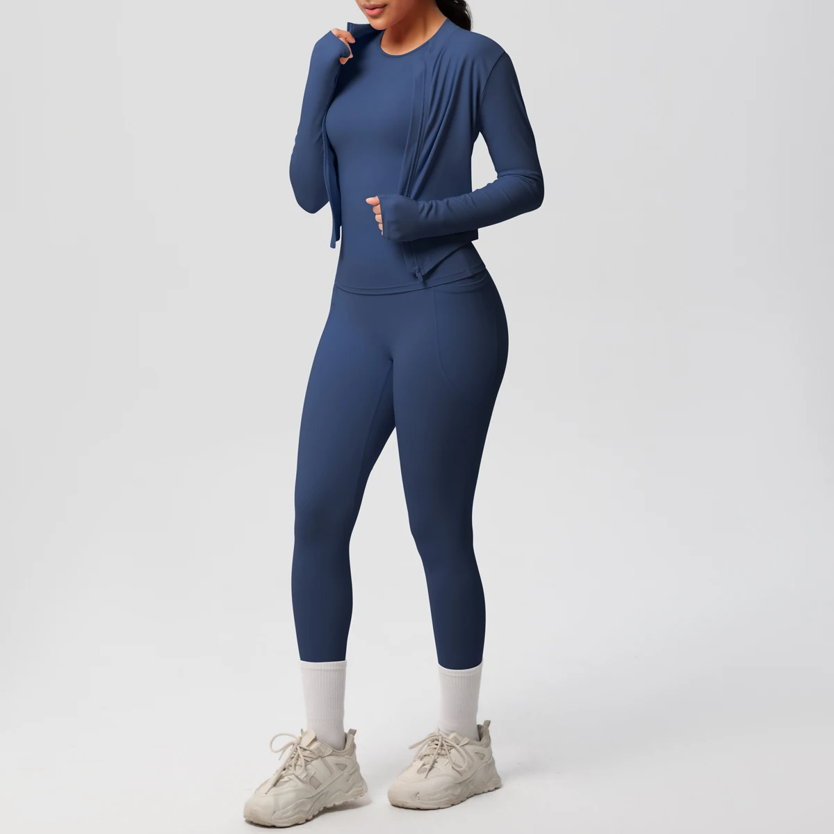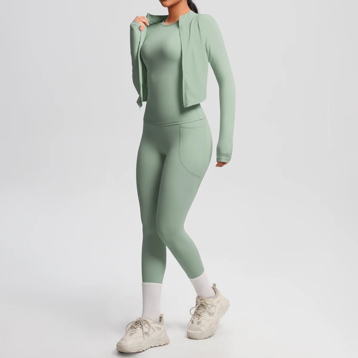 High Quality Lightweight Yoga Clothing Set Long Sleeves Pants with Pockets Easy Breathable Solid Pattern Three Piece Sports Gear