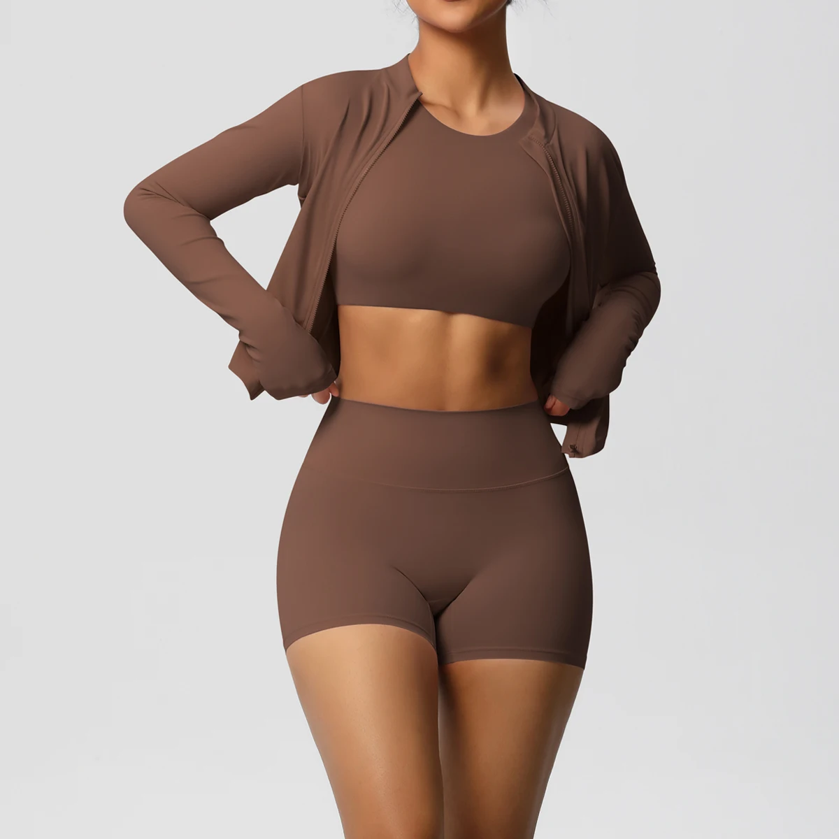 New Women's Sportswear Set Long Sleeve Yoga Zipper Cardigan Shorts Fitness Yoga Clothing 3 Piece Set