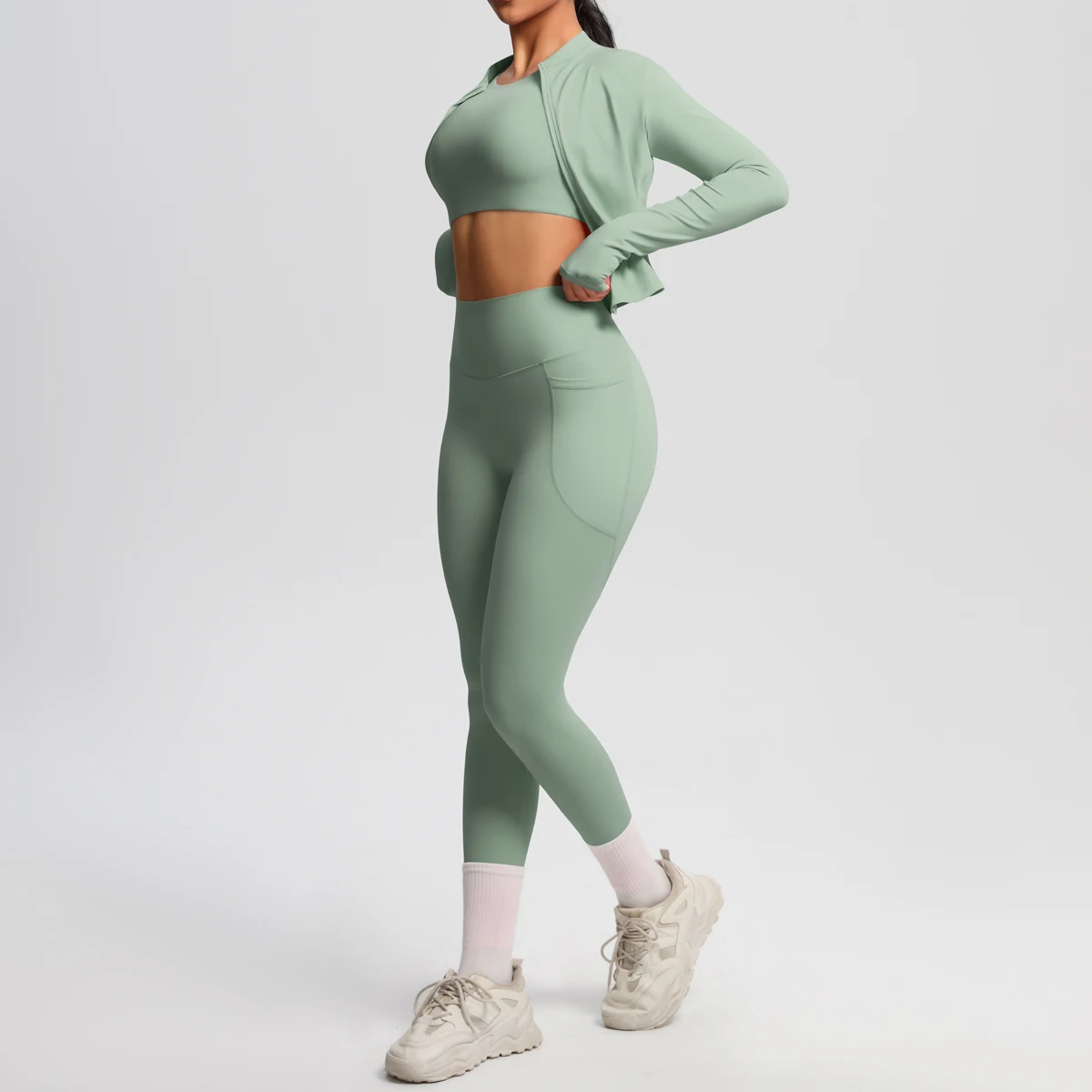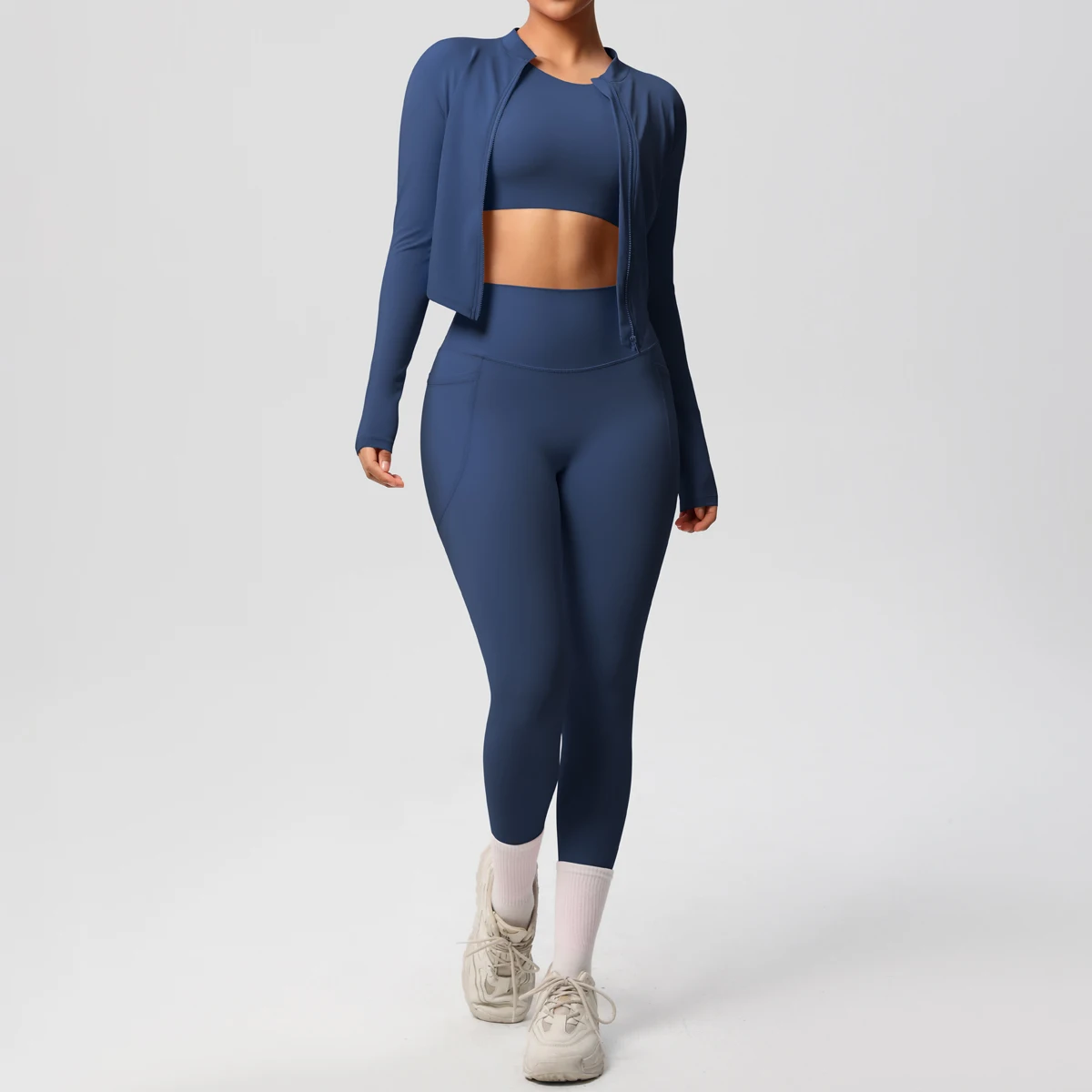High Quality Fitness Yoga Three Piece Suit Long Sleeved Zipper Cardigan Jacket Long Sleeved Vest and Yoga Pants with Pockets