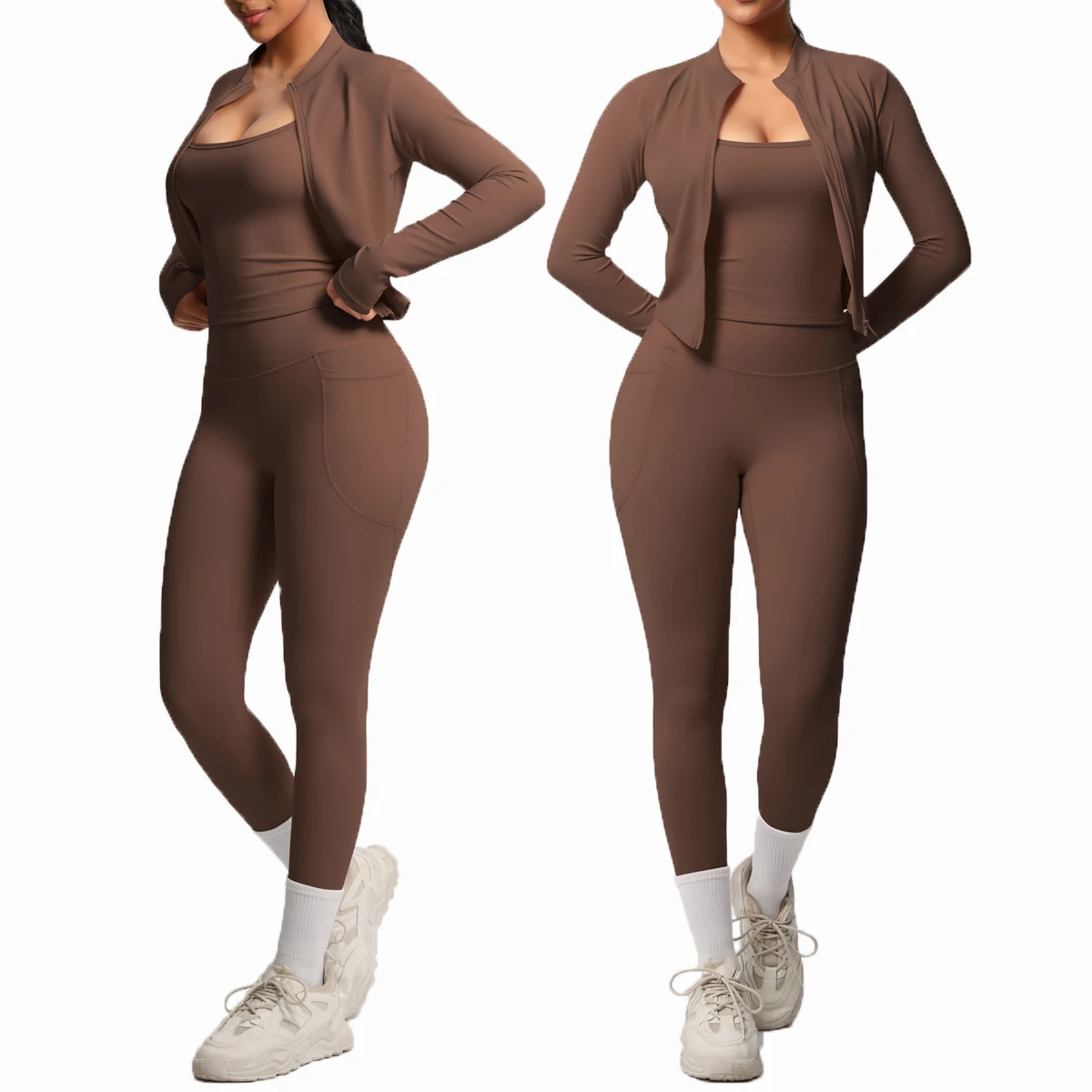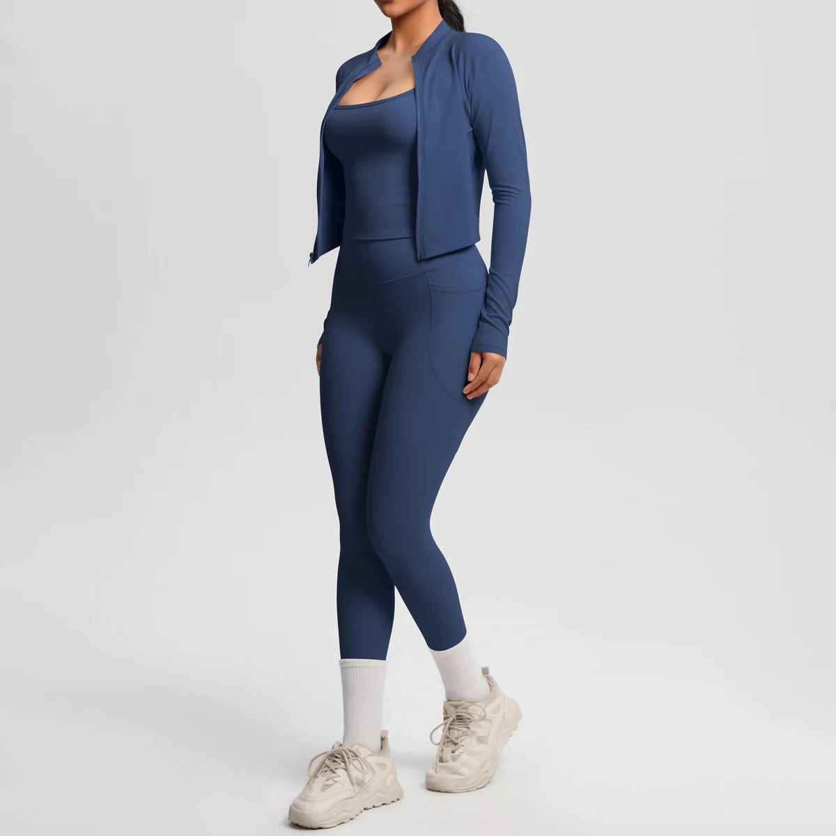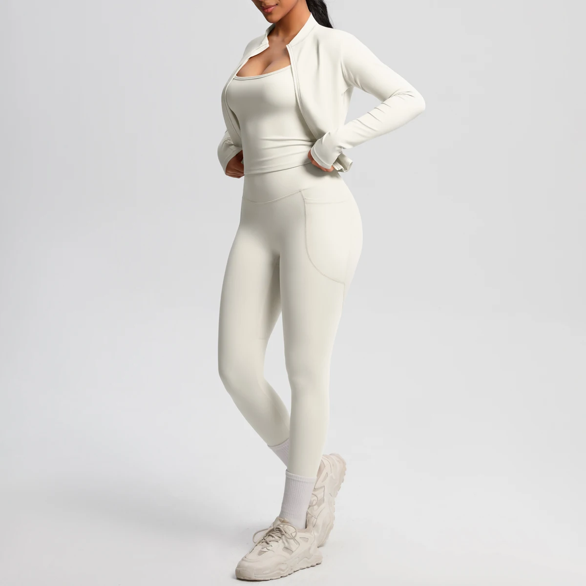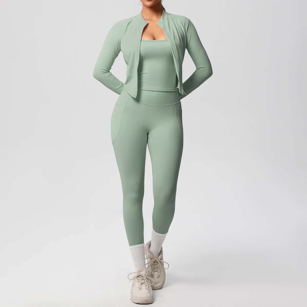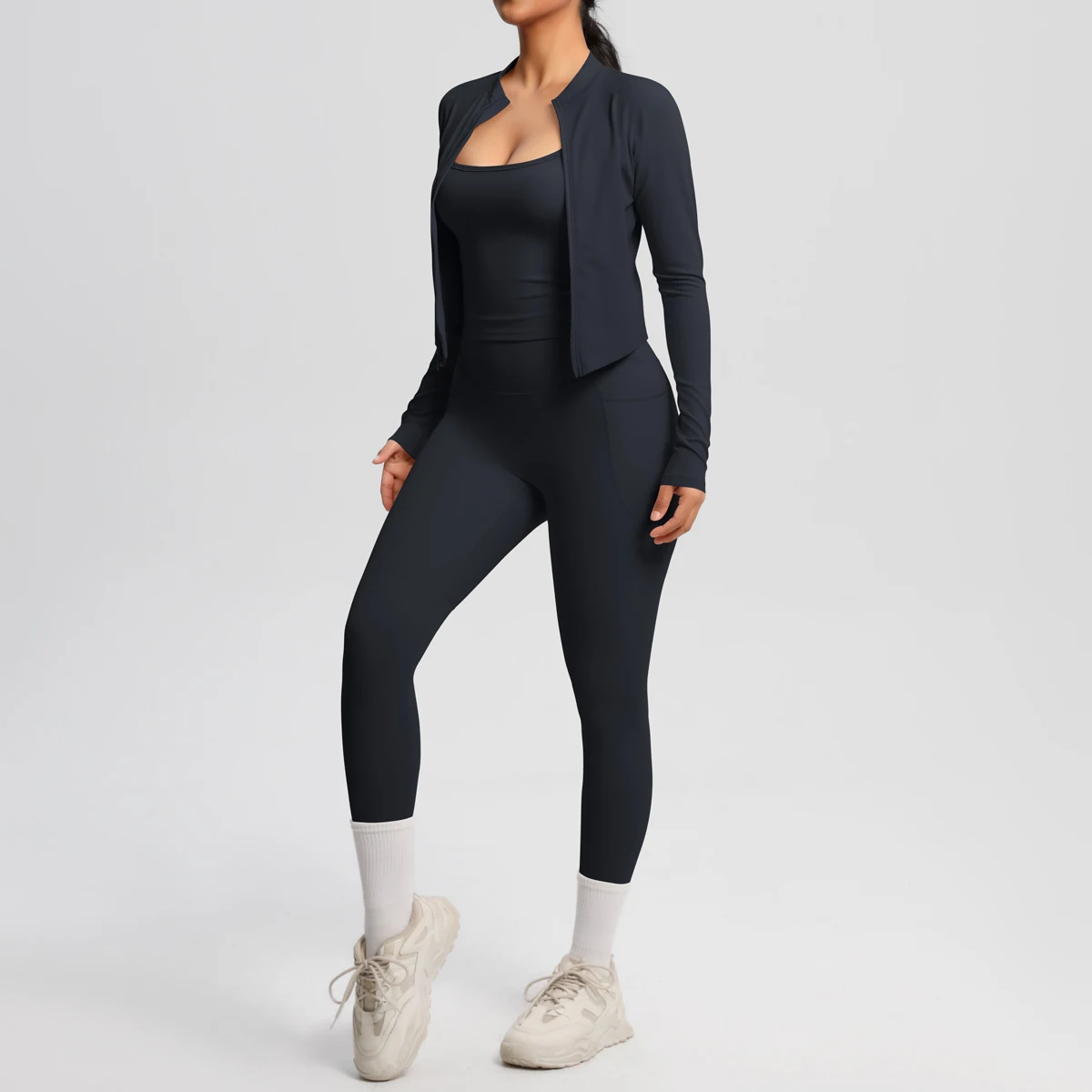 Solid Color High-Waisted Strap Camisole with Zipper Long Sleeve Sporty Jacket with Pockets Breathable Yoga Pants Fitness Set