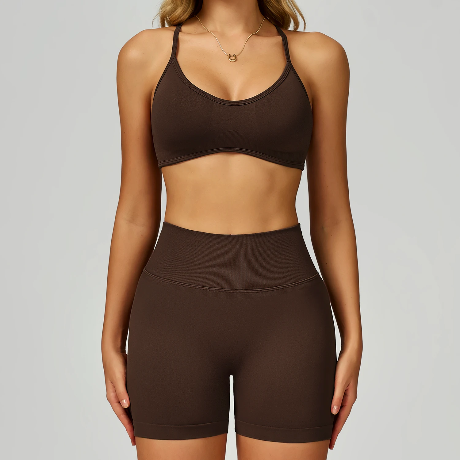 Custom Logo Workout Gym Fitness Set Breathable Beauty Back Sports Bra High Waisted Yoga Shorts with Contrasting Colors