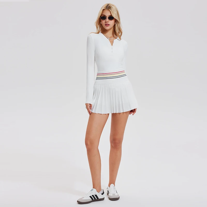 Custom 2 Piece Outfits Gym V-neck Botton Sports Long Sleeve Golf Skirt Workout Fitness Yoga Women Tennis Skirt Sets With Pocket