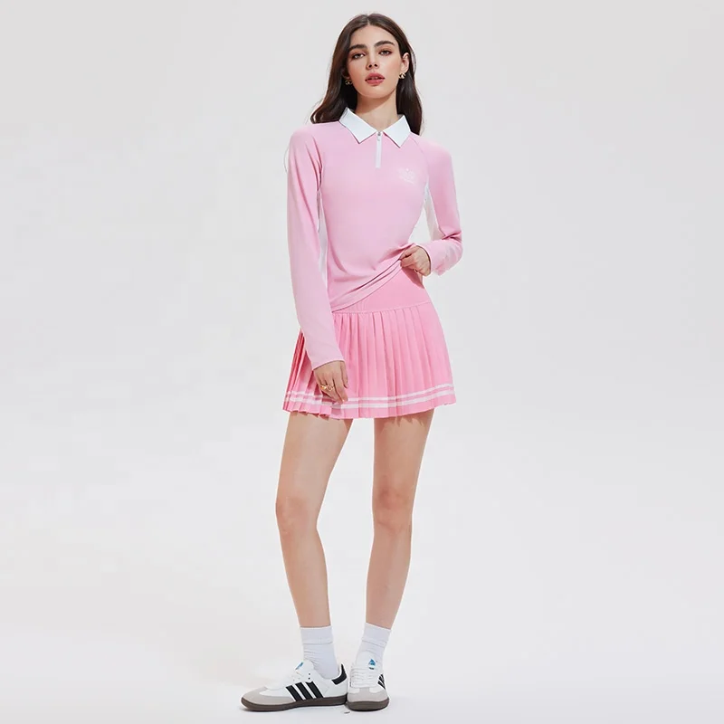 High Quality Fall Casual Outfit Long Sleeve Zip Front Belted Top Mini Tennis Skirt Womens Two Piece Set