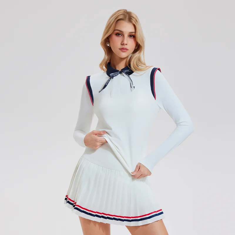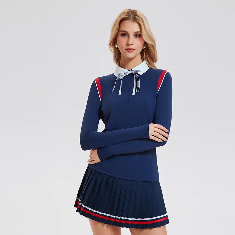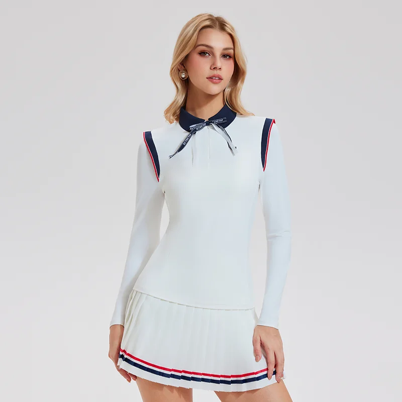 Tennis Wear Athletic Sports Turn Collar Half-Zipper T-Shirts Women Long Sleeves Yoga Wear Golf Tops with Bow
