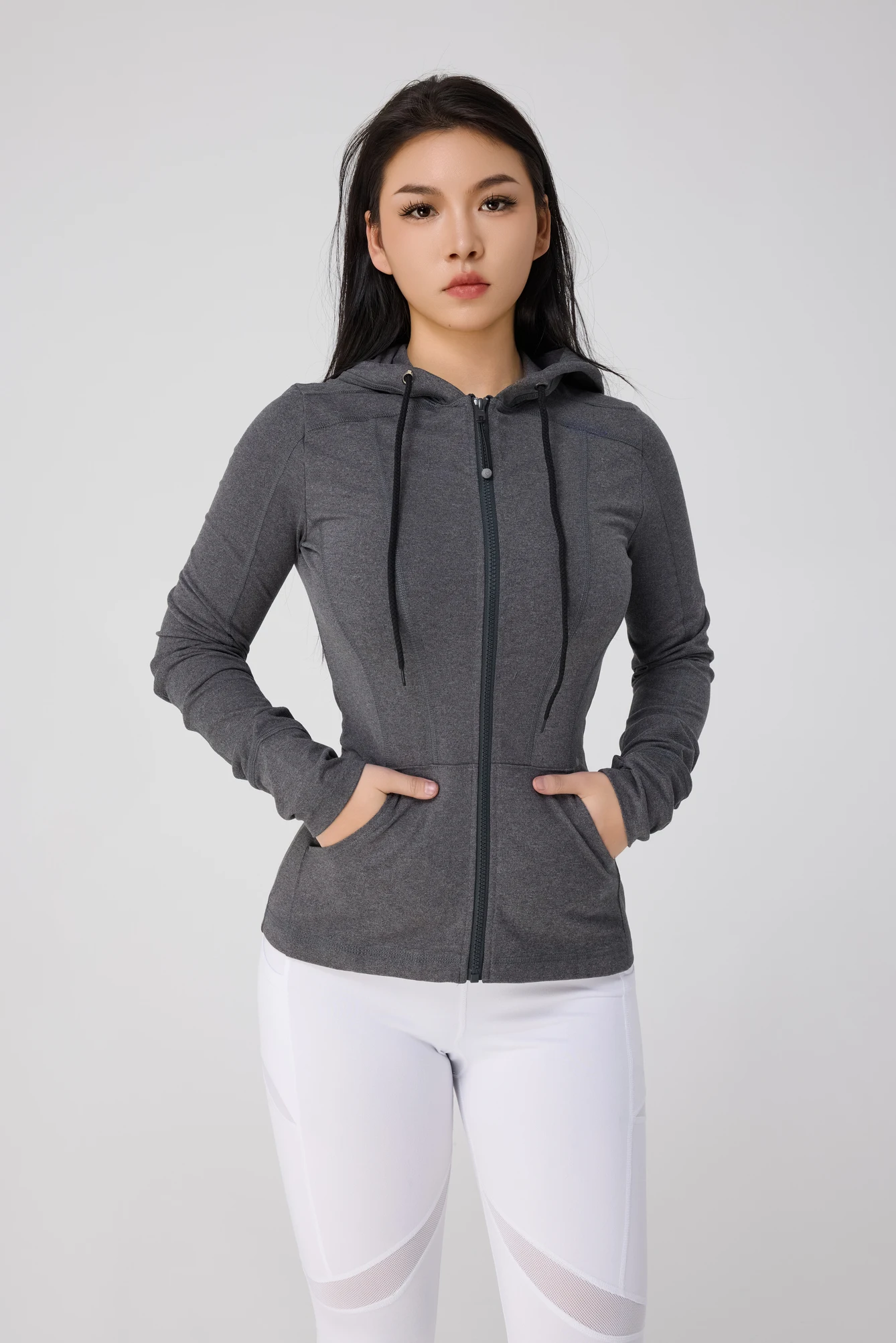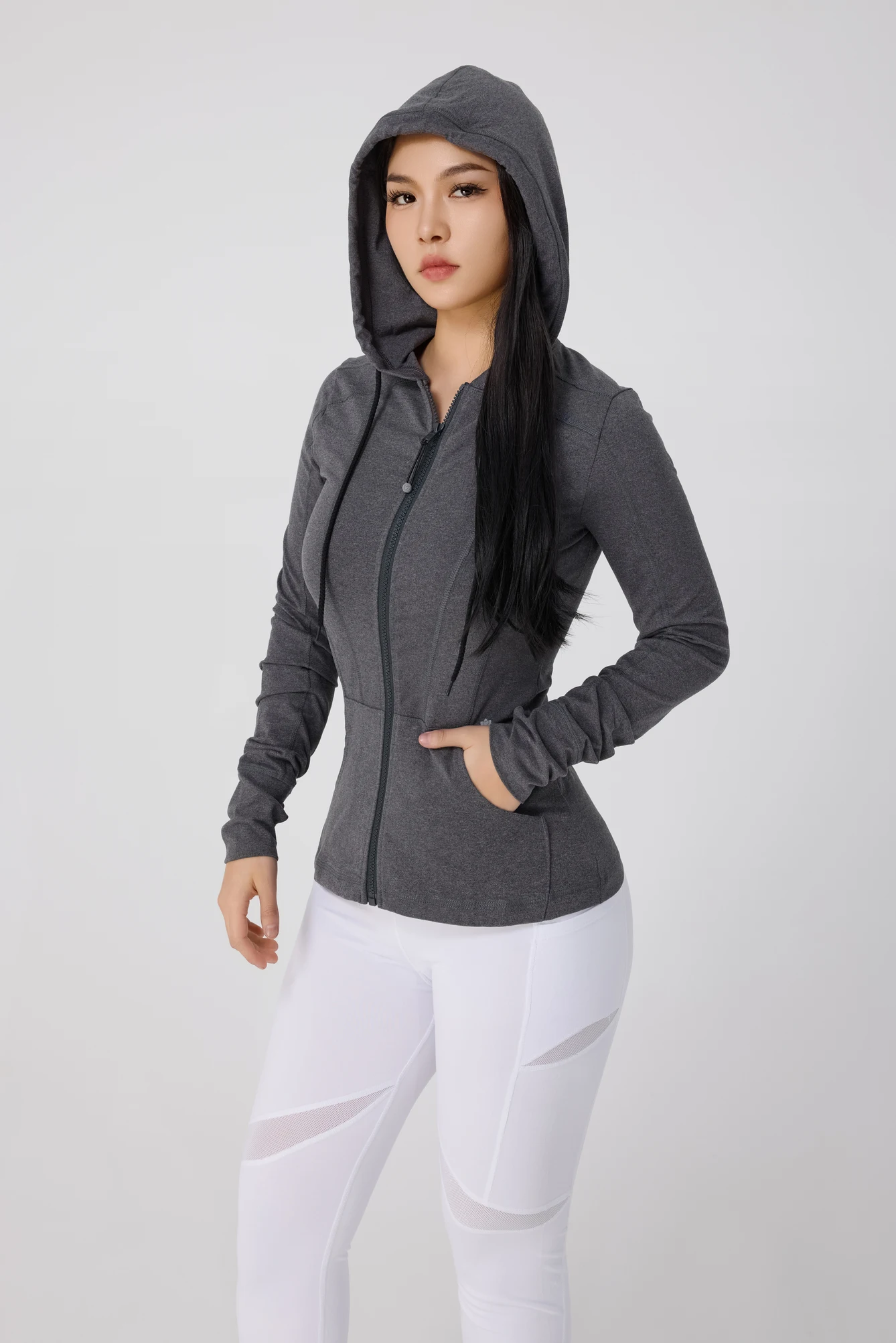 YISHENHON Custom Logo Slim Workout Top Yoga Jackets Zipper Womens Tight Quick Dry Long Sleeve Yoga Sports Coat With a Hat