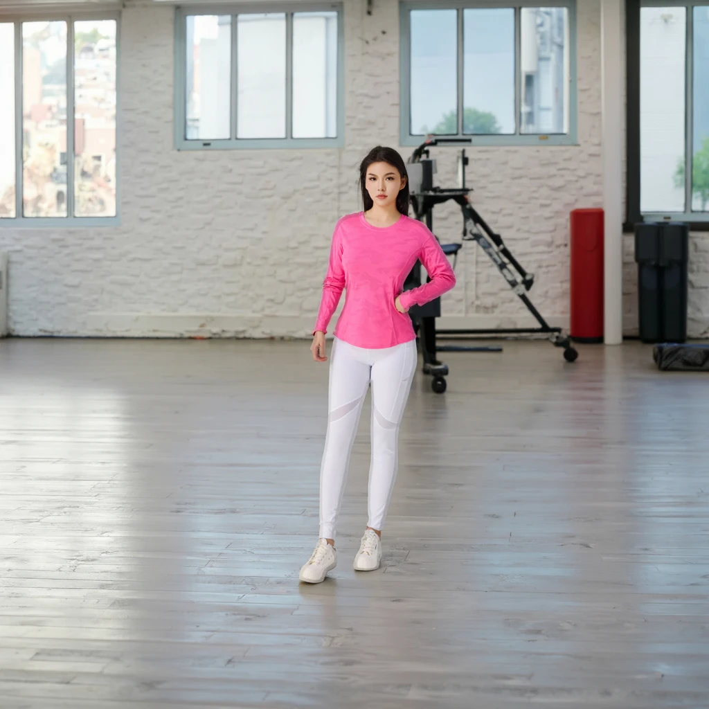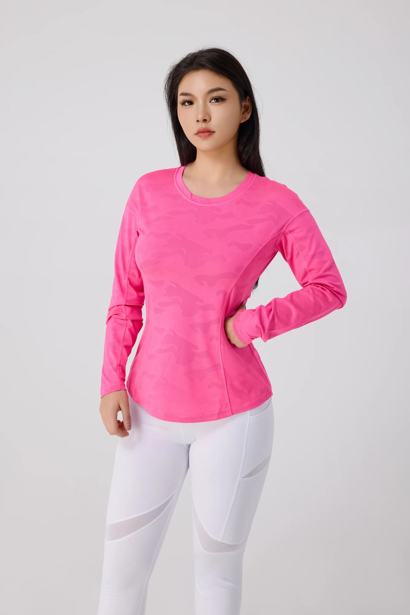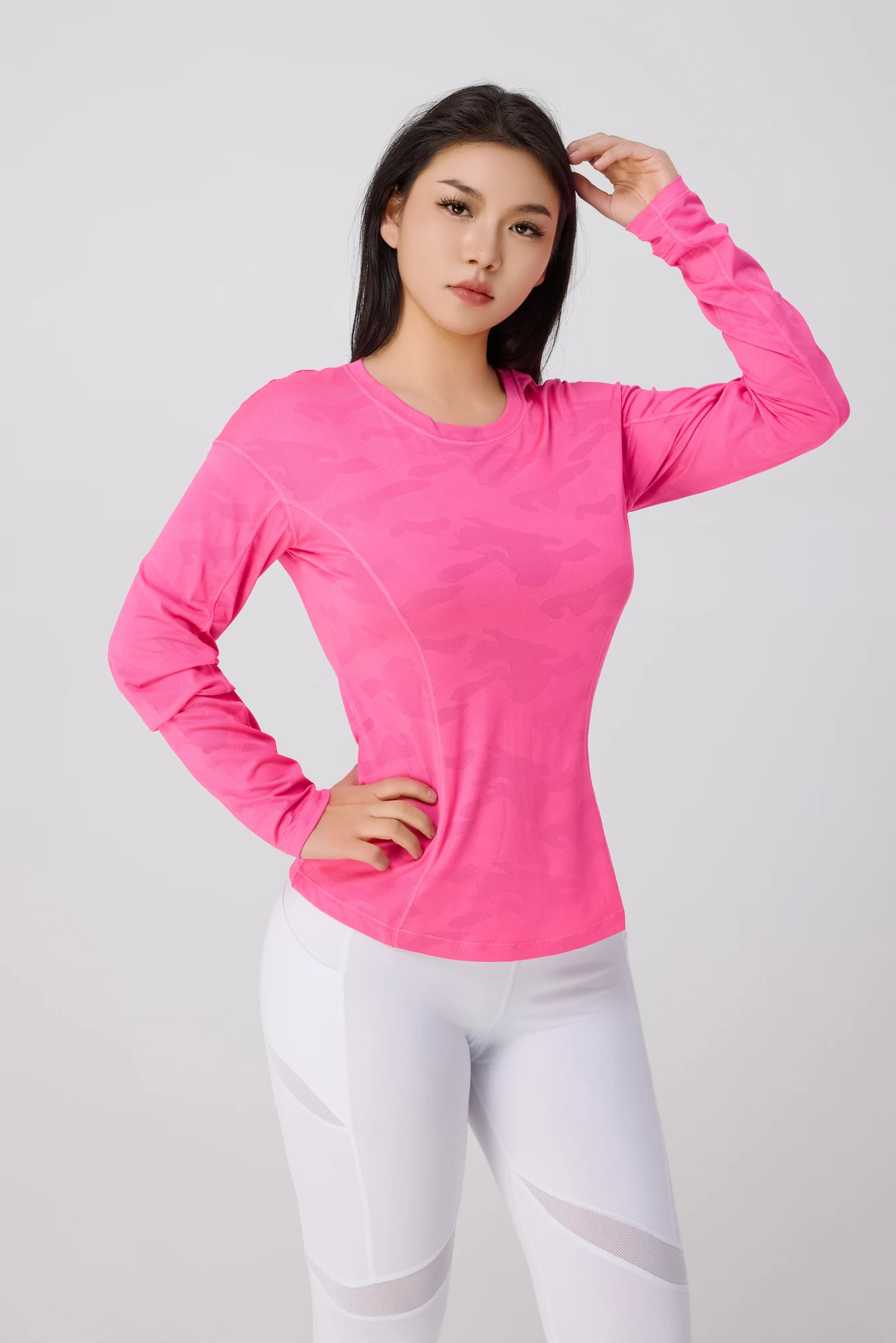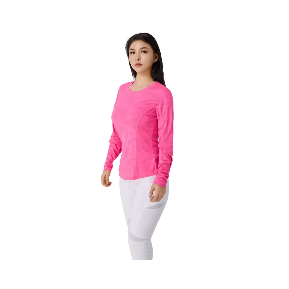 Women's Breathable Long Sleeve Yoga Sports Top with Front Logo Elegant Pink Printed Round Collar Yoga Wear