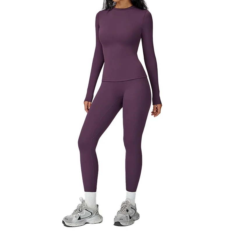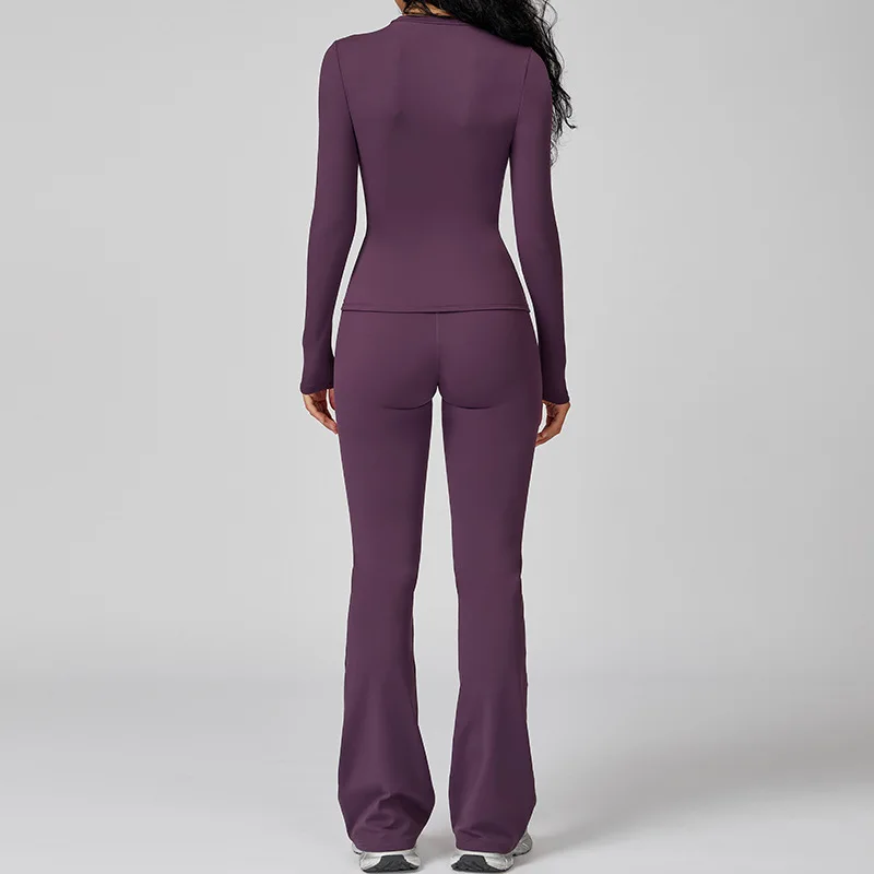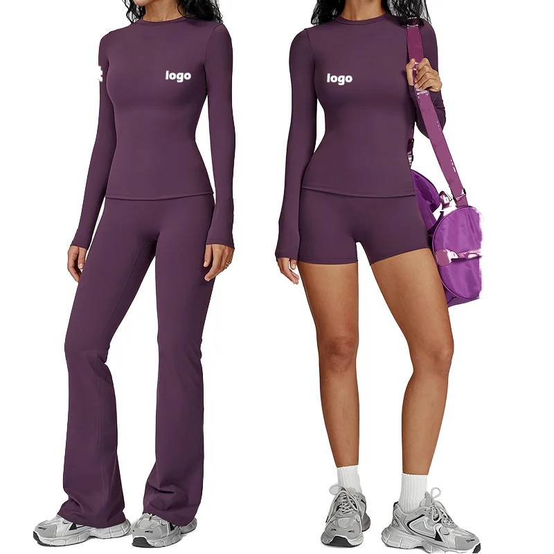 Personalized Customization Solid Front Woman Outfit Activewear Long Sleeve T Shirts High Waist Tummy Control Flare Pants Gym