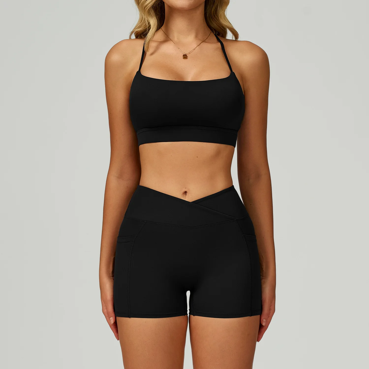 Lightweight Nylon Yoga 2-Piece Set Breathable Quick Dry Shockproof Tank Top Elastic Waist Sports Shorts Side Pocket Yoga Set