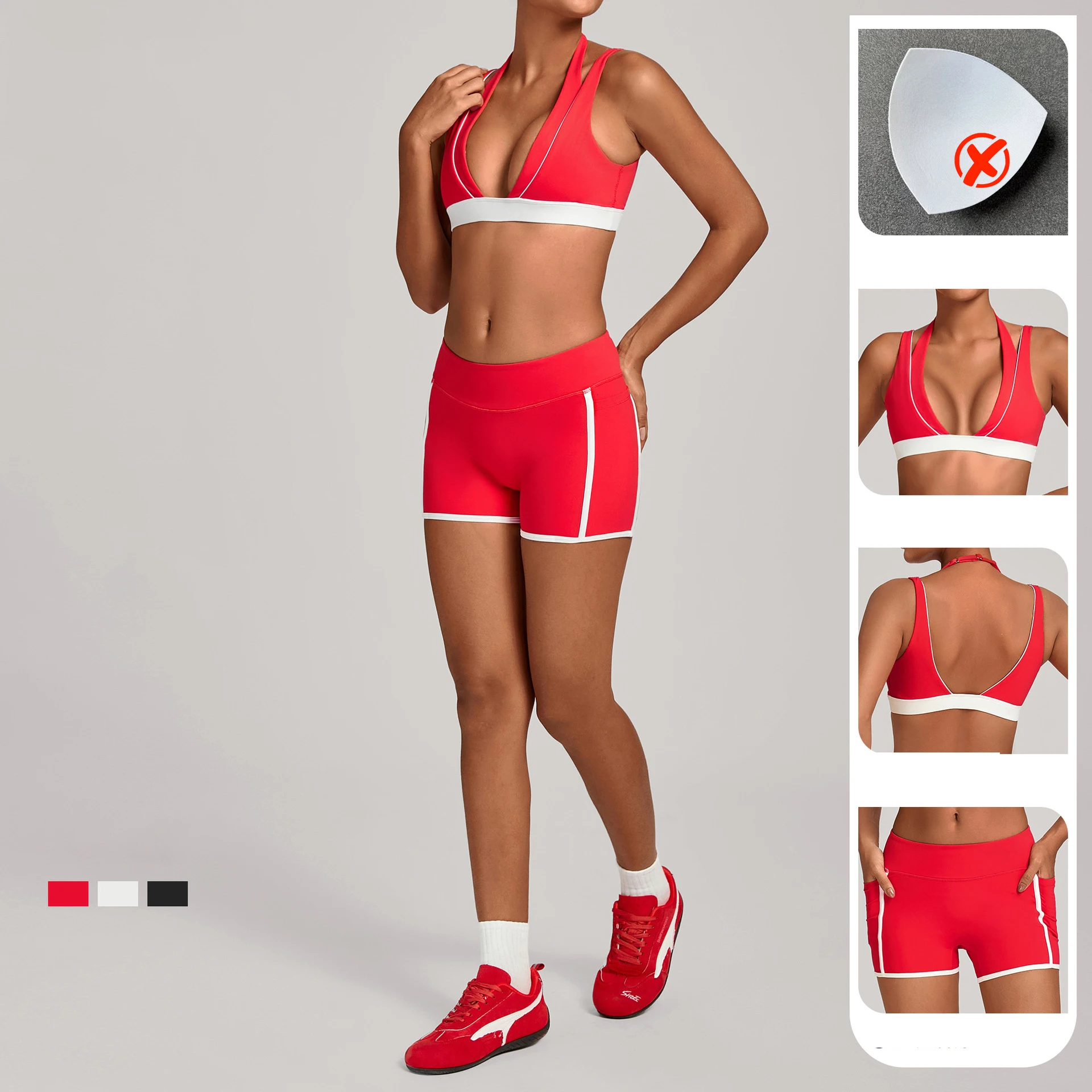2026 Activewear Double Layer Contrast Color Halter Neck Sports Bra High Waist Shorts Set 2 Piece Yoga Set