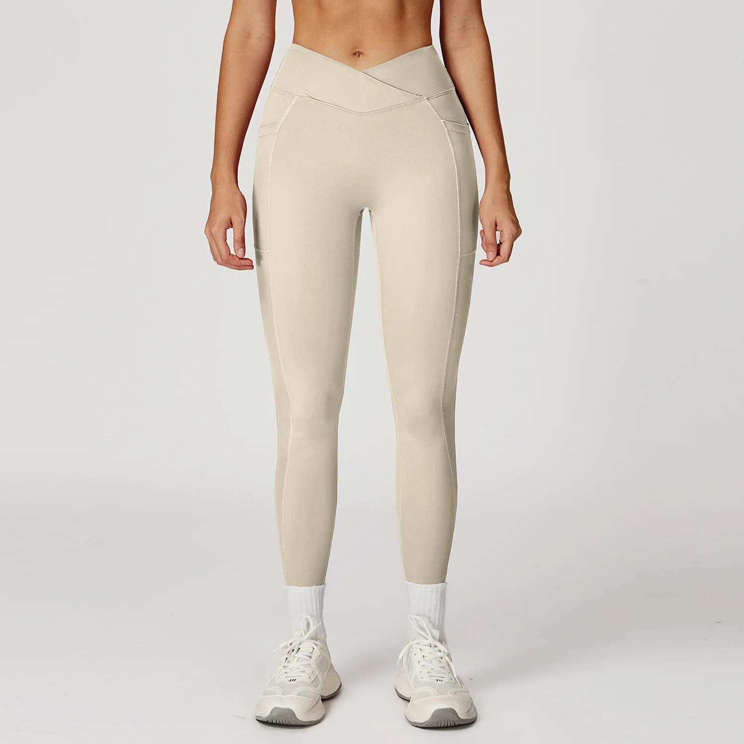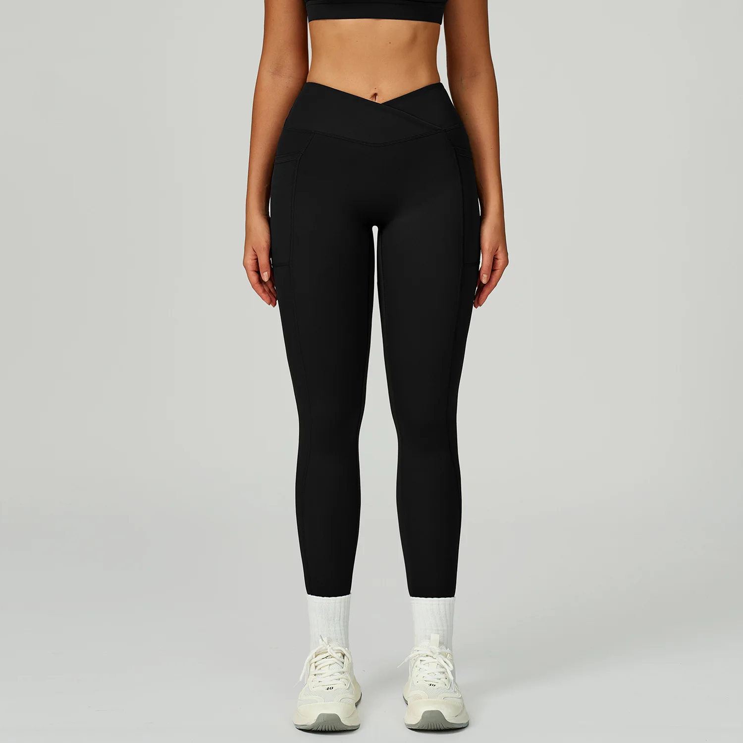 Women's High-Waisted Cross Waist Yoga Pants Side Pockets Butt-Lifting Leggings for Gym