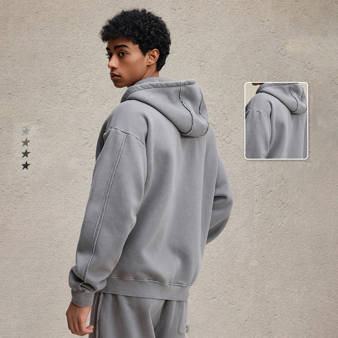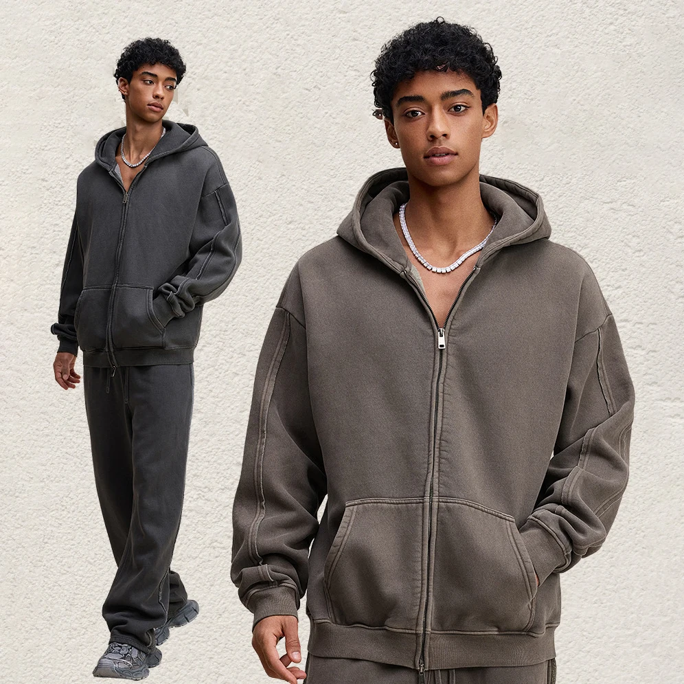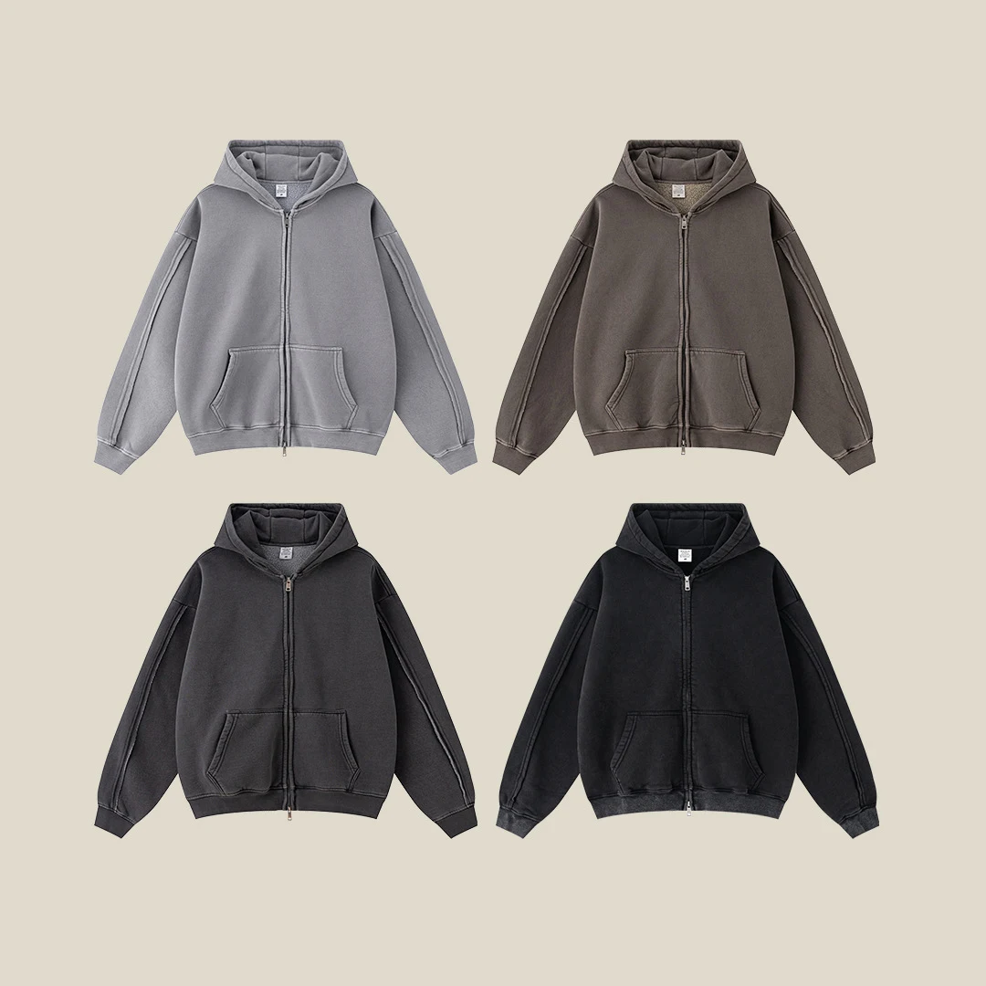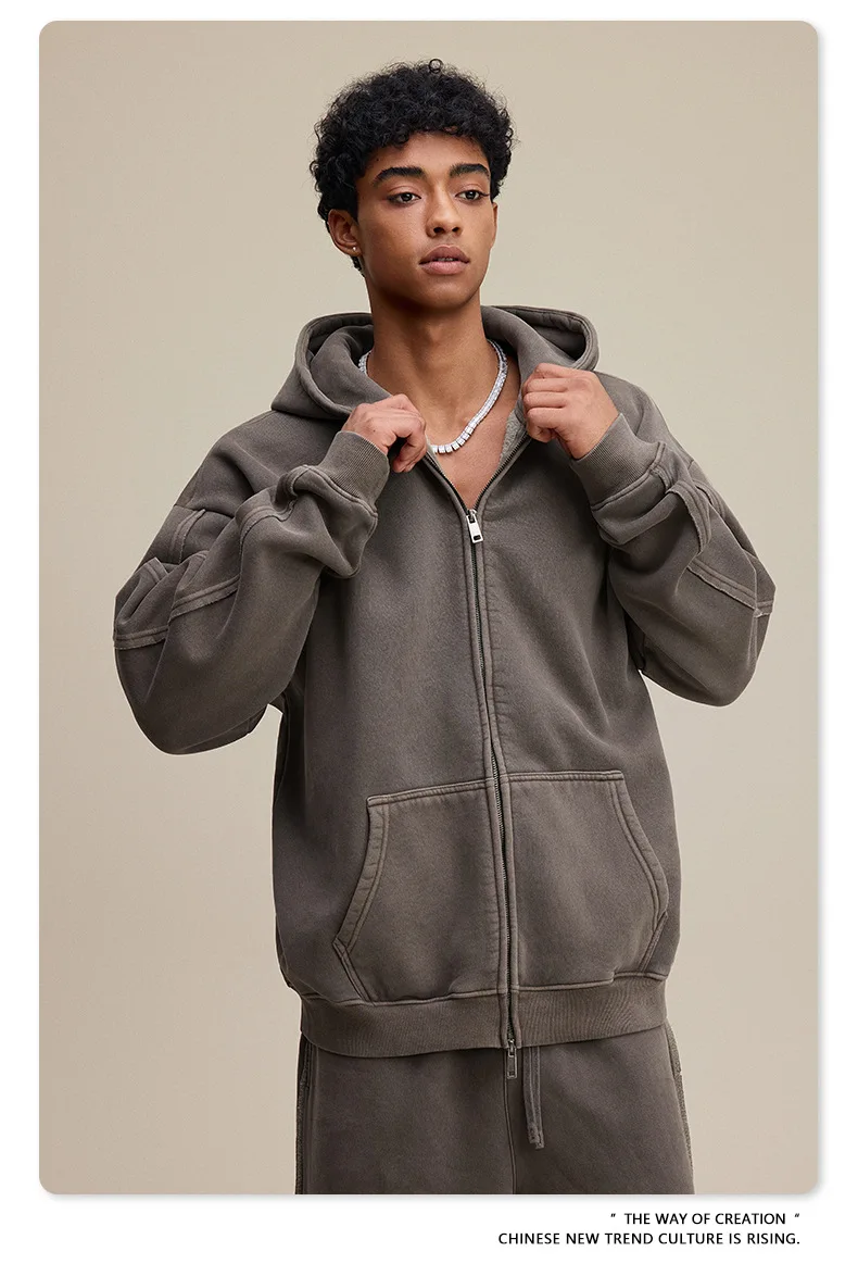 Autumn Winter Mens 400 GSM Cardigan Thick Batik Raw Hem Patchwork Retro Double Zipper Hoodie Washed Heavyweight Fleece Hoodies