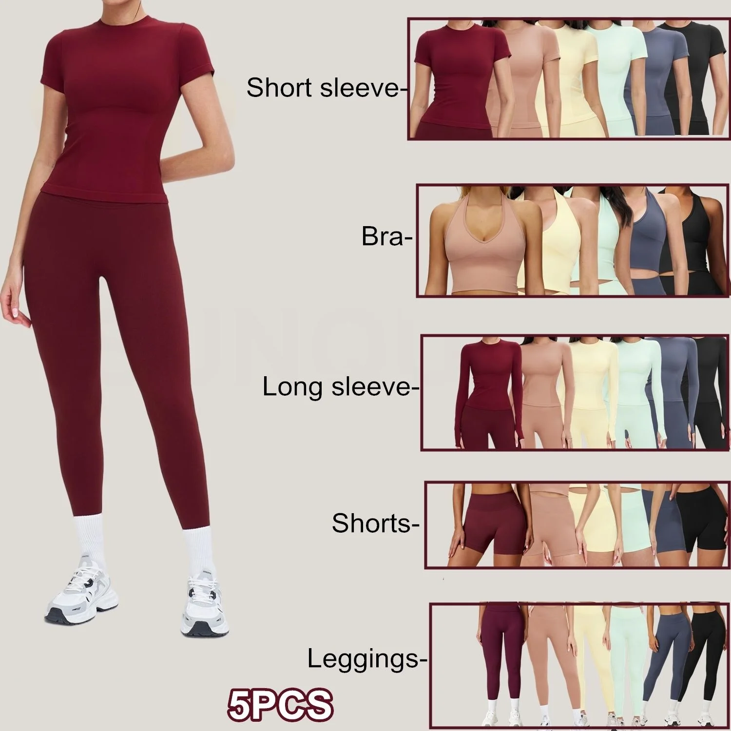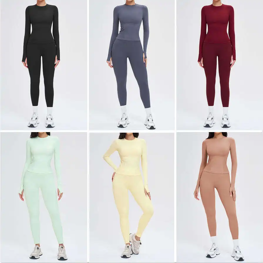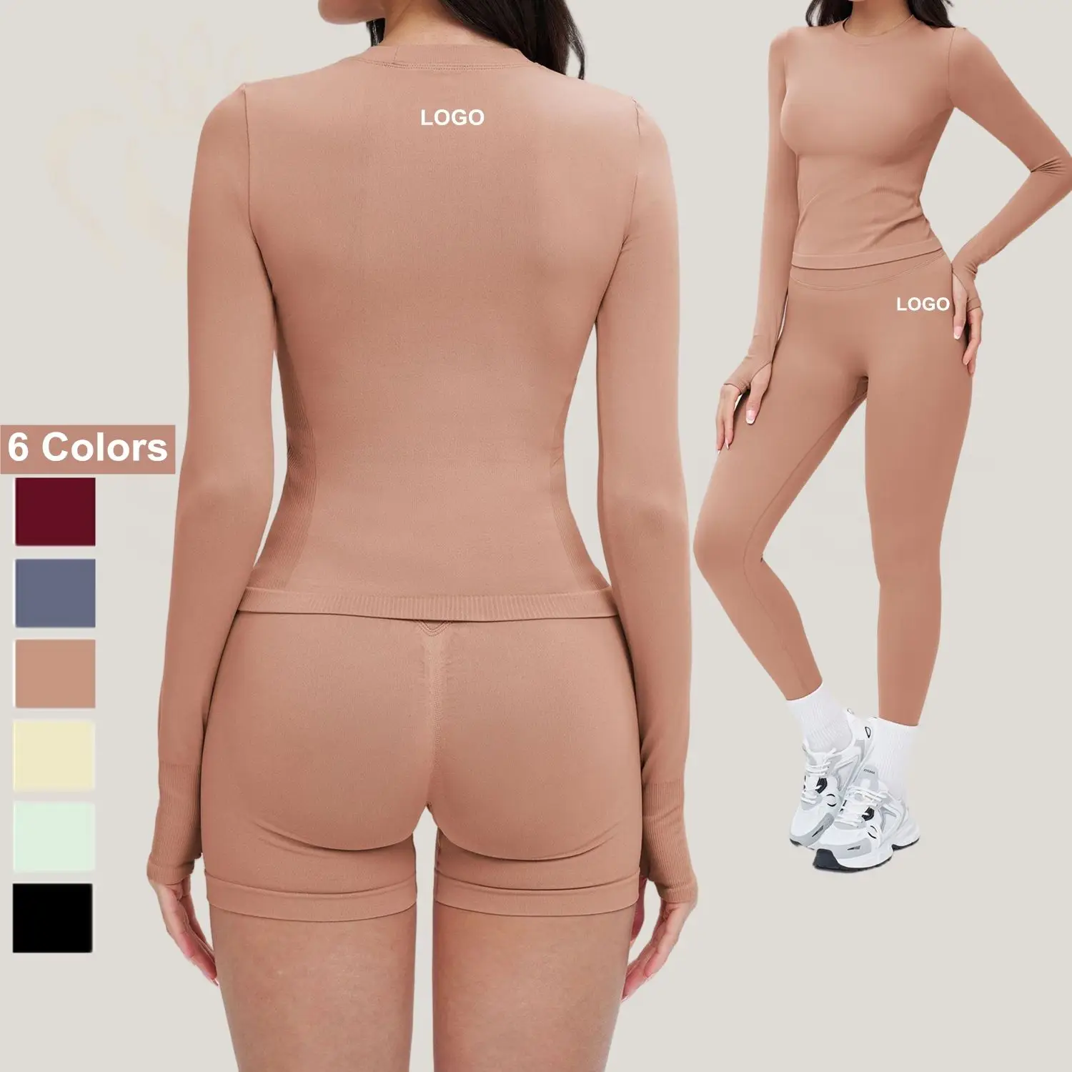 Nylon Women Seamless Washed Yoga Set Long Sleeve Top High Waist Peach Hip Lift Leggings Solid Washing Sports Suit