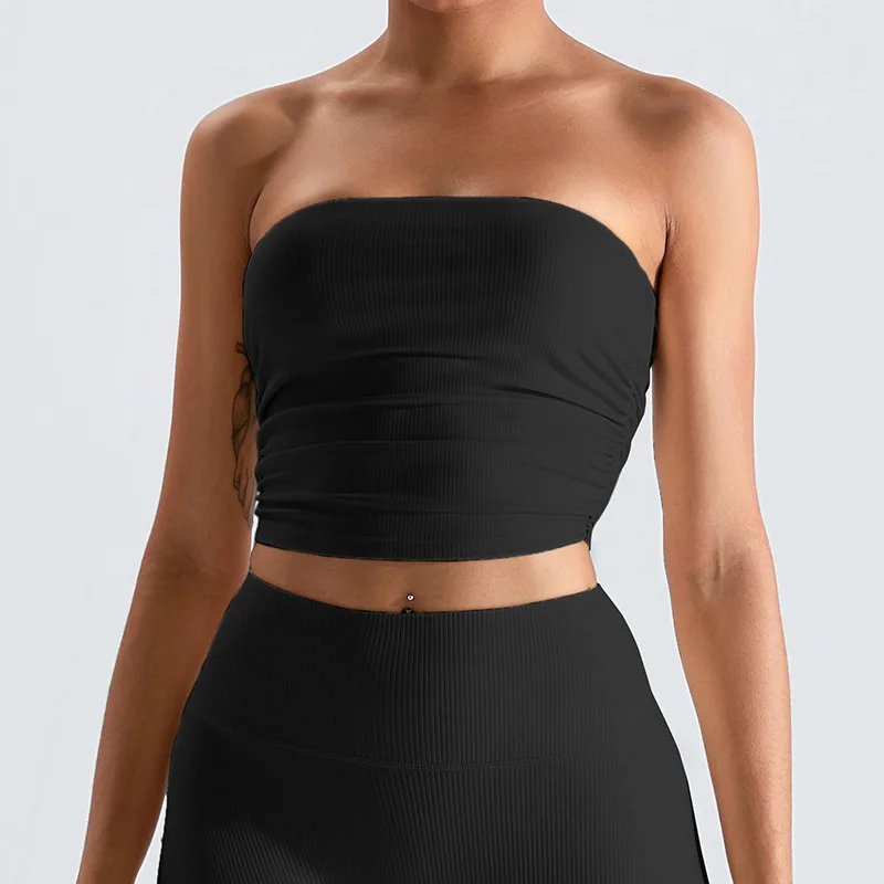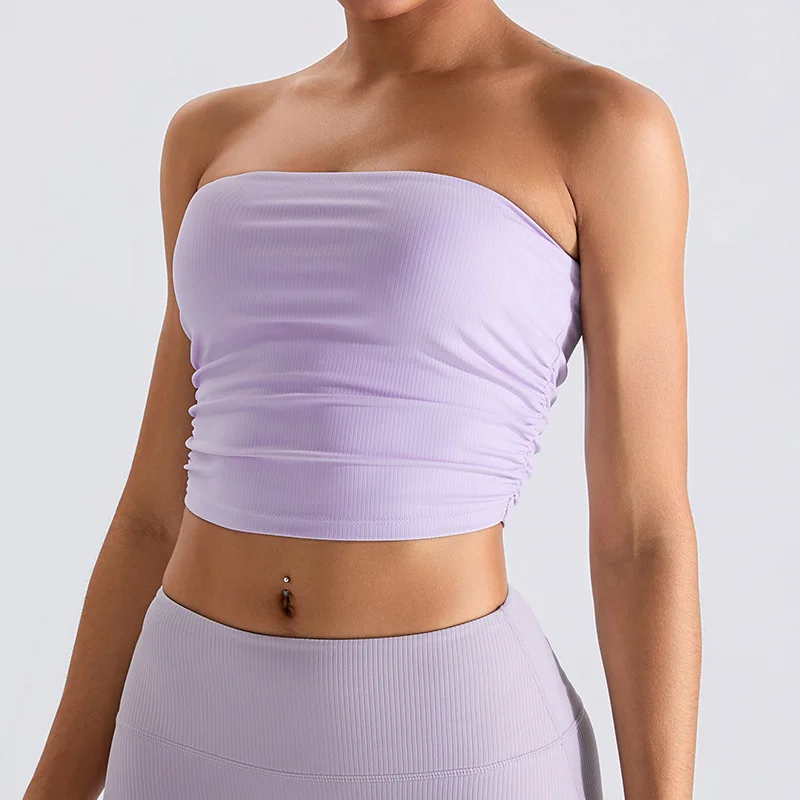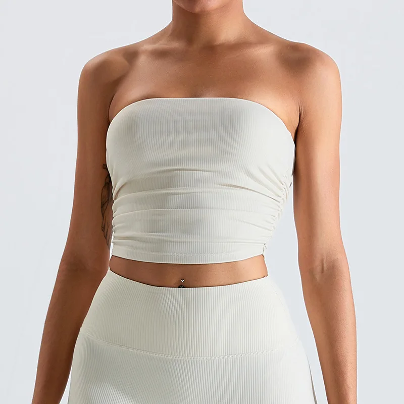 Custom Logo Women Ribbed Sexy Bandeau Crop Top Tube Yoga Fitness Bras With Side Pleats