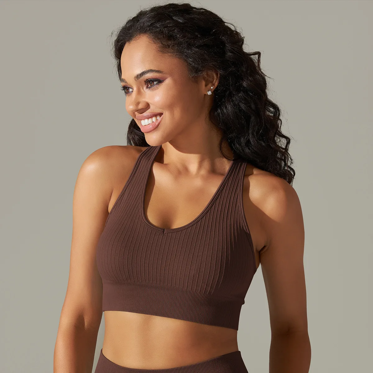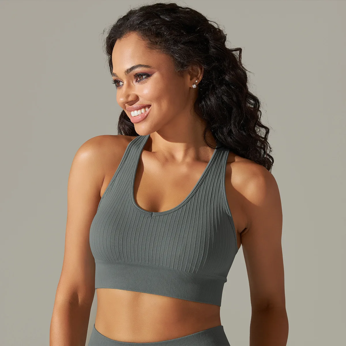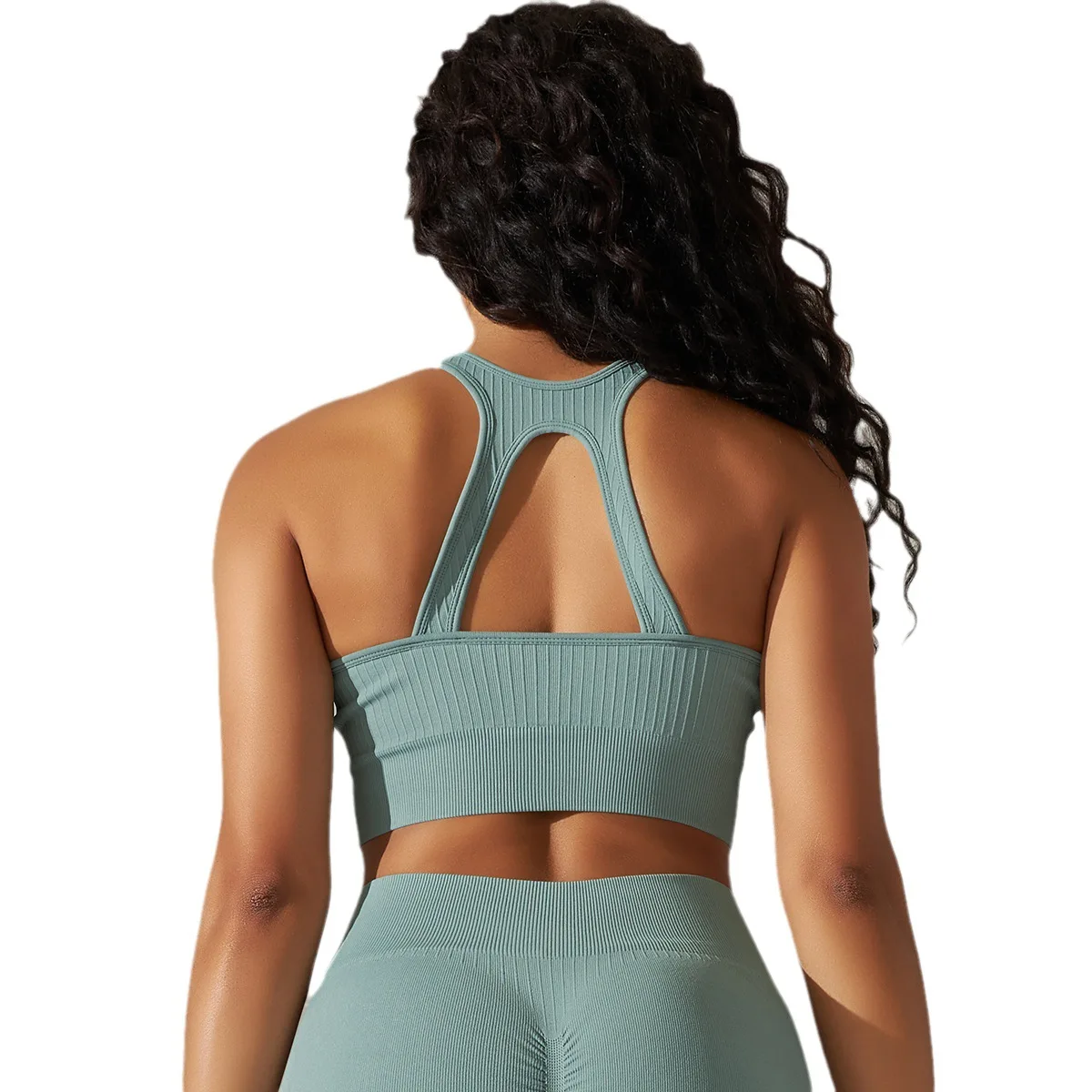 Women Deep U Neck Fitness Bra Seamless Ribbed Racerback Yoga Crop Top Slim Fit Gym Bra