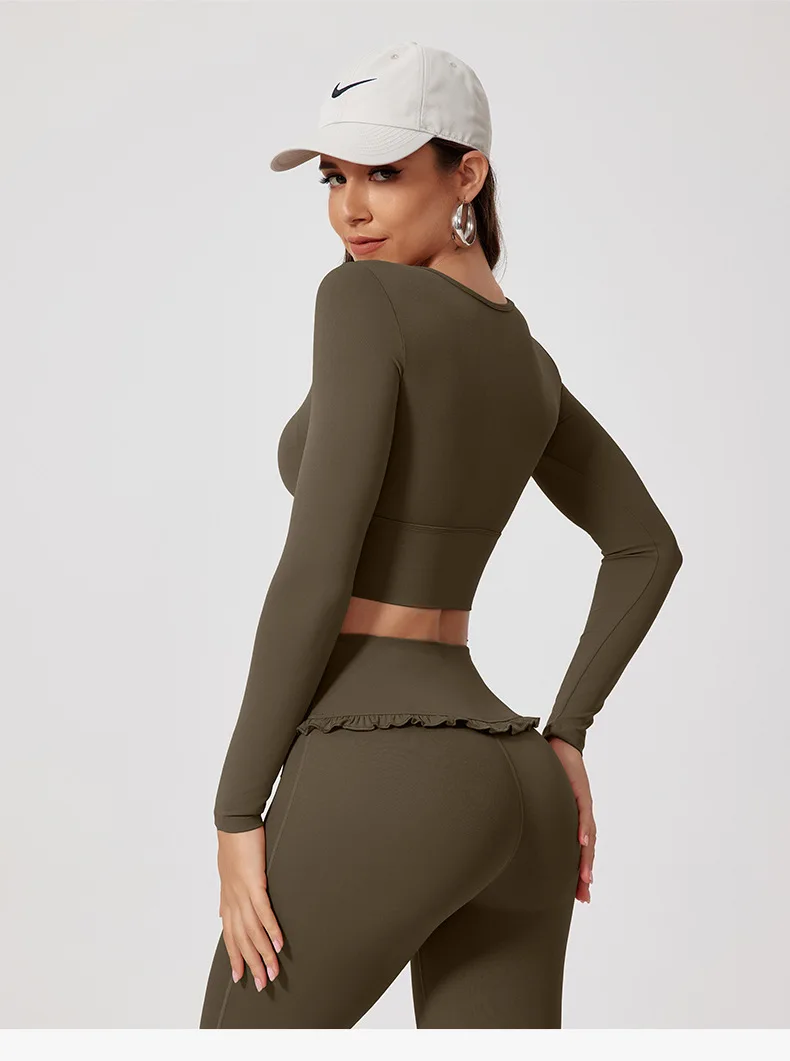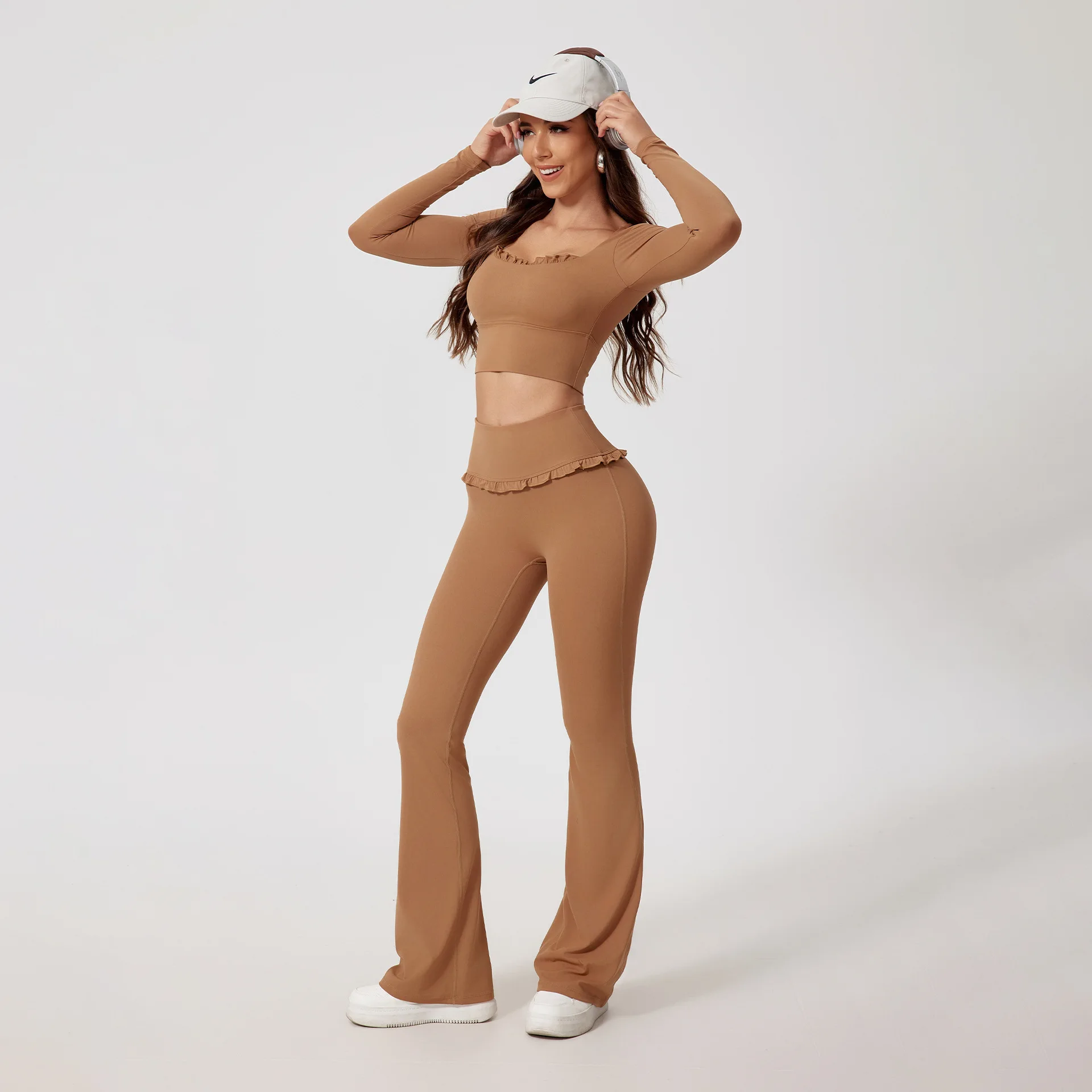 Hot Sale Gym Set Long Sleeve Lace Square Collar Top High Waist Butt Lift Flare Pants Sportswear Skin Friendly Yoga Outfits