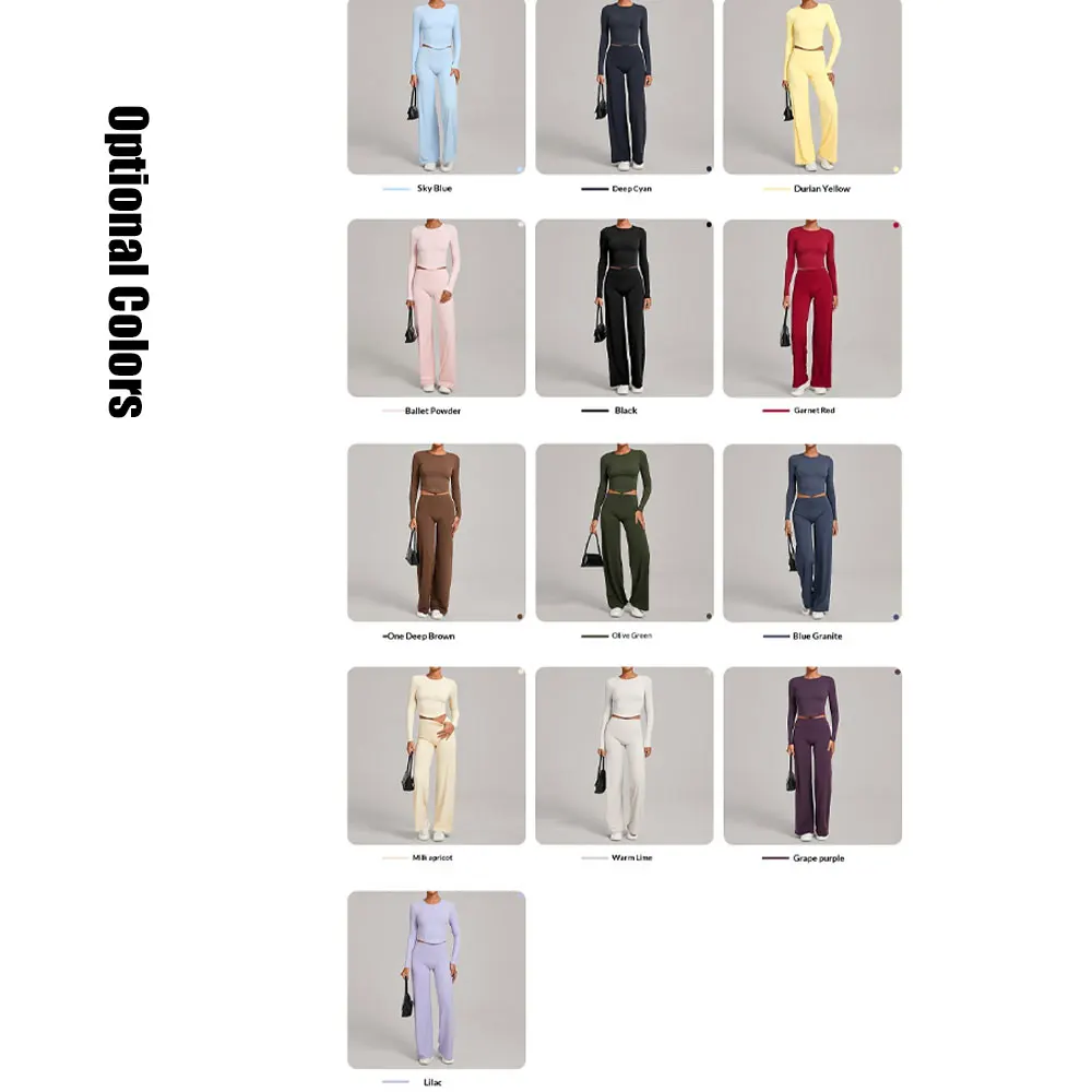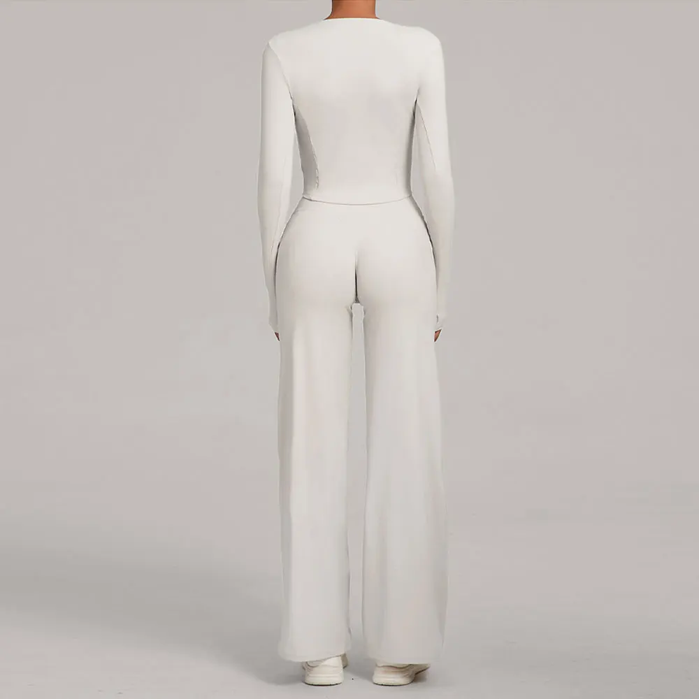 Women's Solid Color Sports Set Long Sleeved Skin Friendly High Waisted Workout Wide Leg Pants Fitness Yoga Set