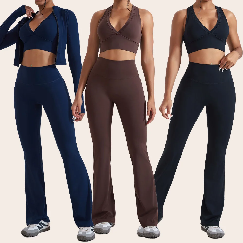 OEM High Waist Women's Flare Gym Fitness Yoga Tummy Control Sports Bra Biker Sportswear Suits Long Sleeve Zipper Jacket Set