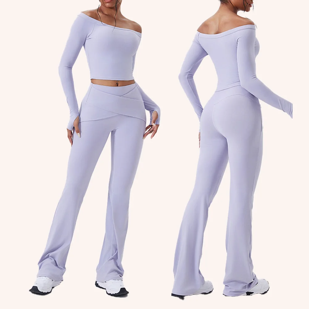Off-Shoulder Long Sleeved Yoga 2-Piece Fitness Suit High Waist Tight Pants Indoor Pilates Fitness Suit Plus Size Yoga Suit