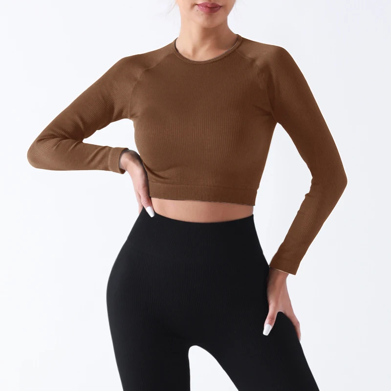 Round Neck Yoga Slim Fit Waist Tight Slim Short Sports Long Sleeve Elastic Fitness Yoga Top for Women