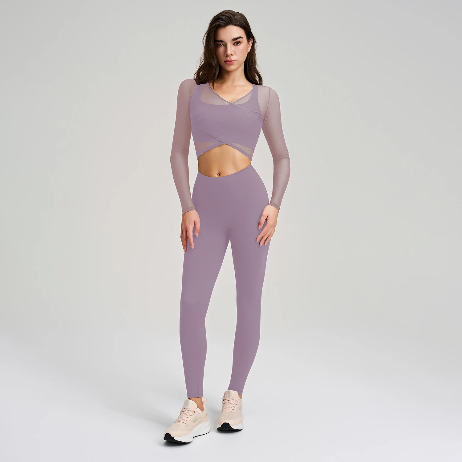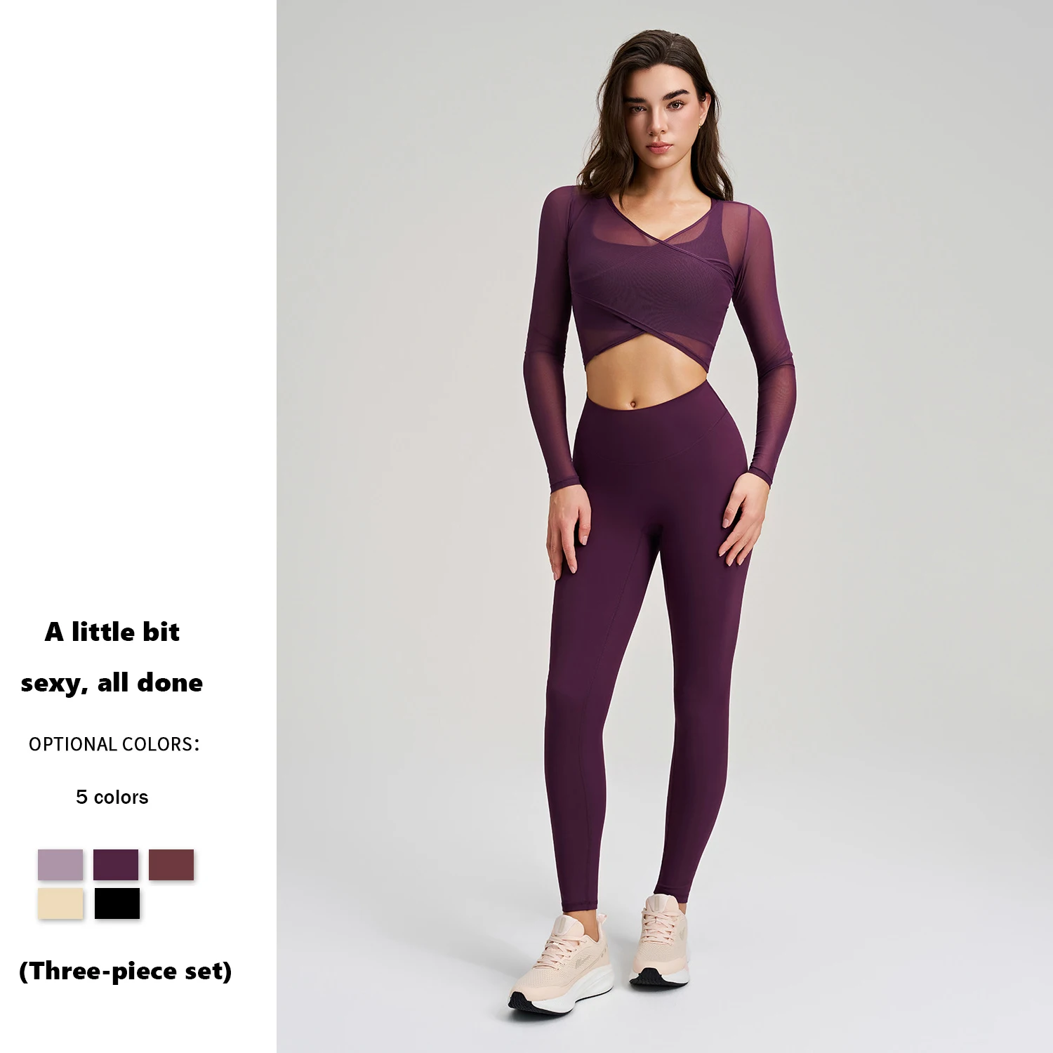XW-YG-557-1 Women Gym Clothing Butt Lifting Legging Long Sleeve Solid Breathable Bra High Waist Fitness 3 Piece Yoga Wear Set
