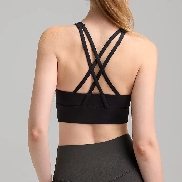 Wholesale Custom Solid Color Cross Straps Back Soft Excise Running Ladies High Neck Yoga Top Breathable Workout Pads Bra