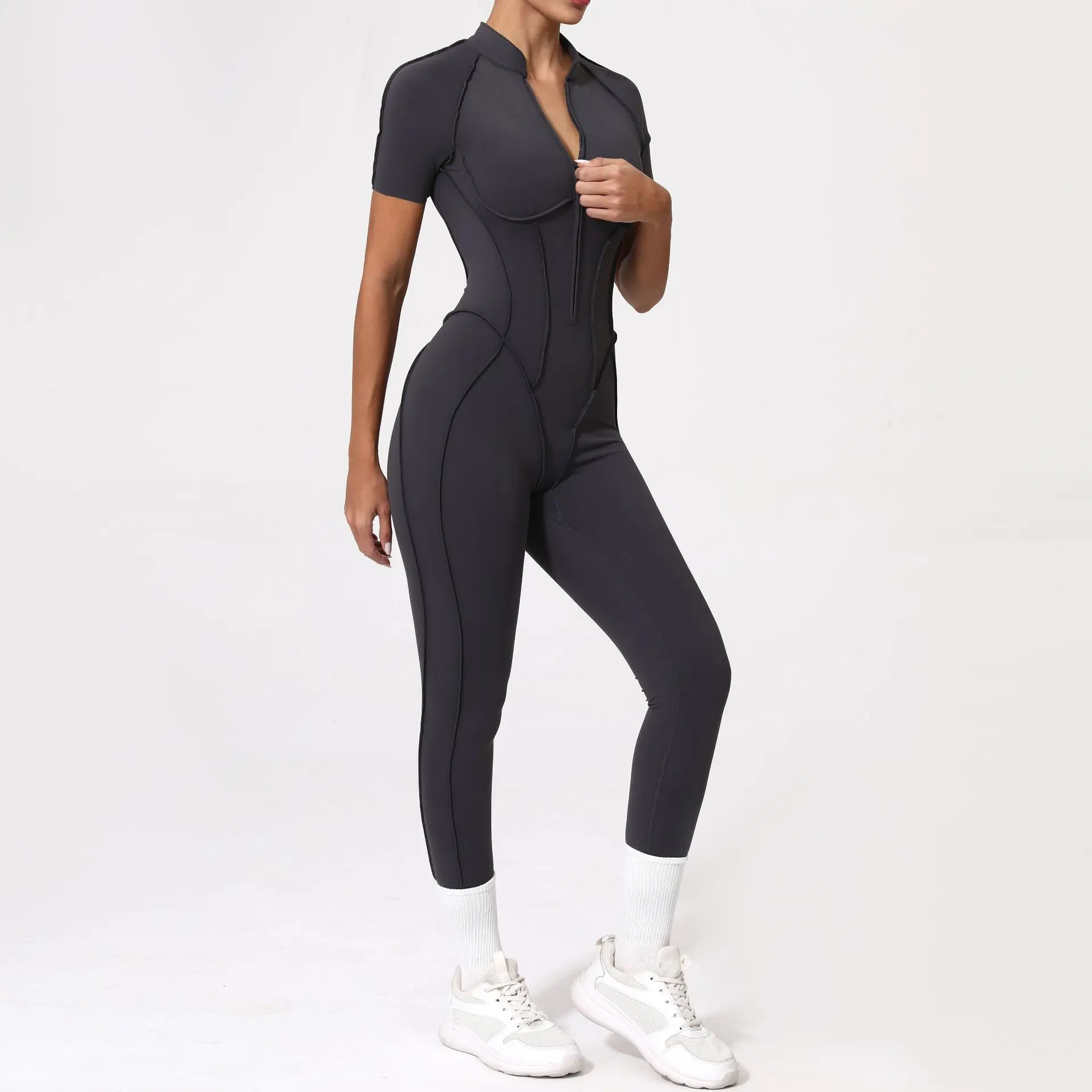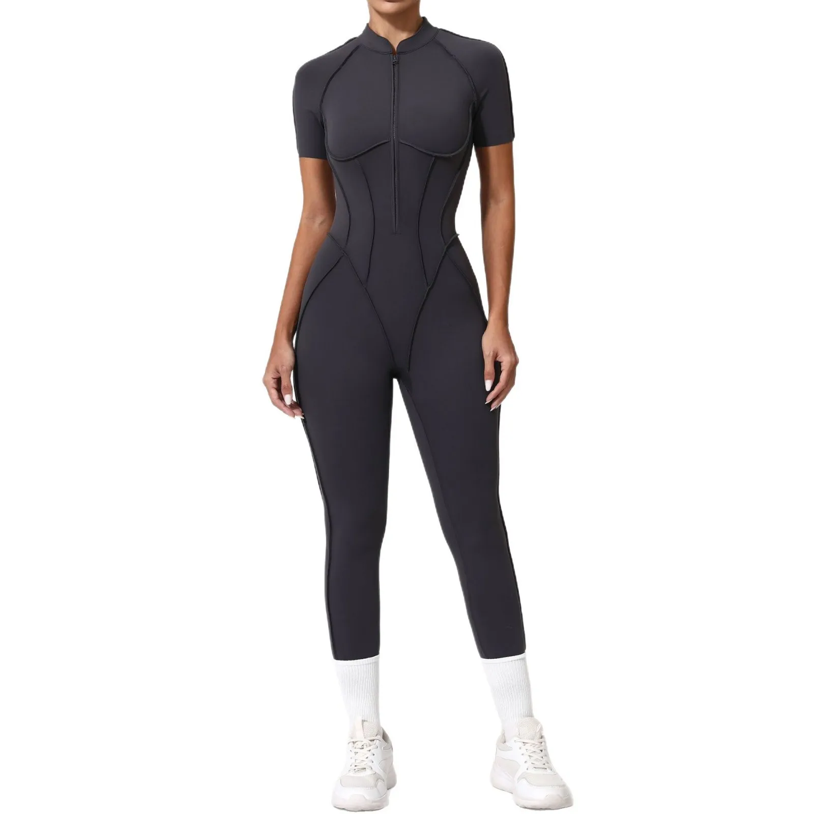 Women's Sexy One Piece Sports Bodysuit Short Sleeve Zip-Up Romper with Bottom Pants Bodycon Workout Jumpsuit