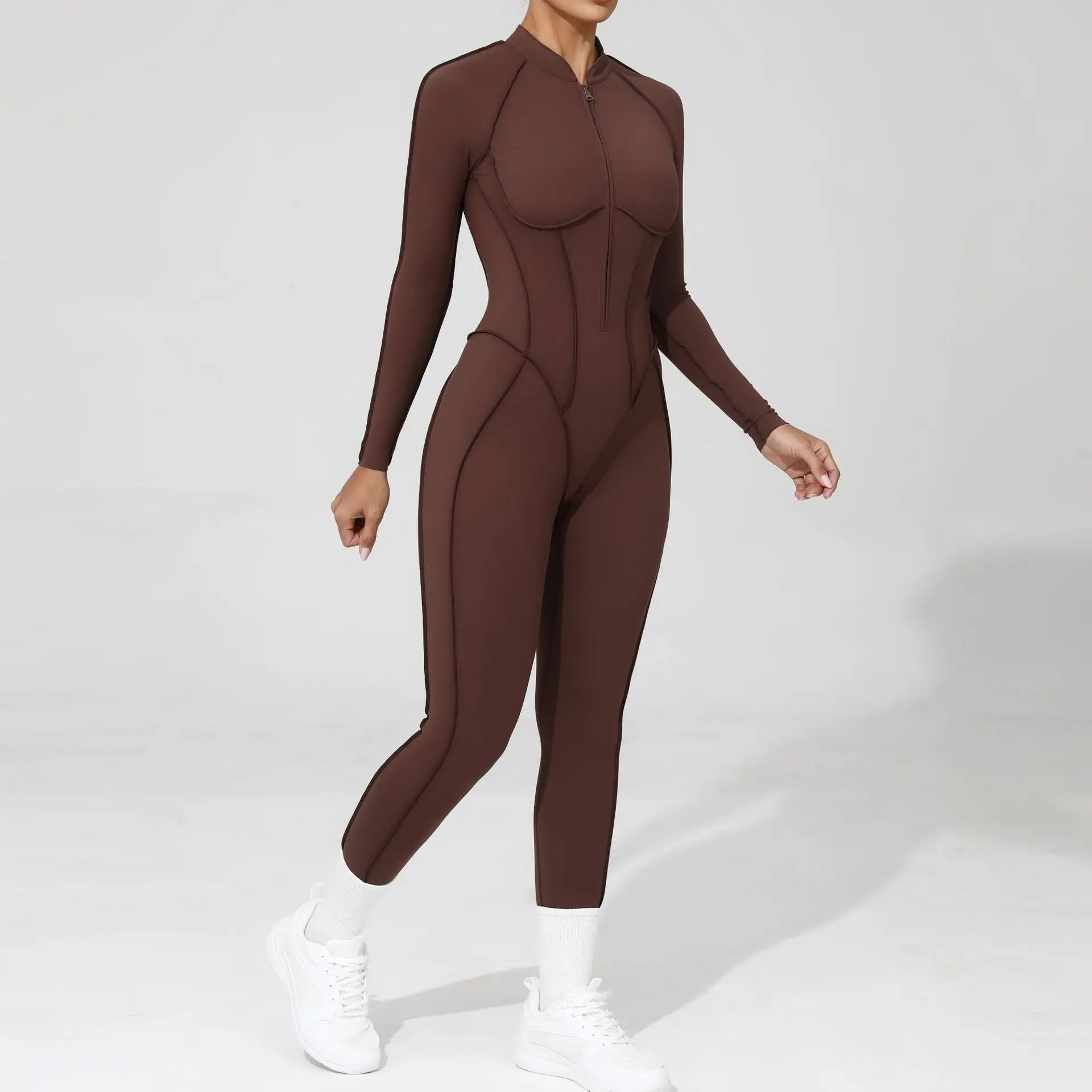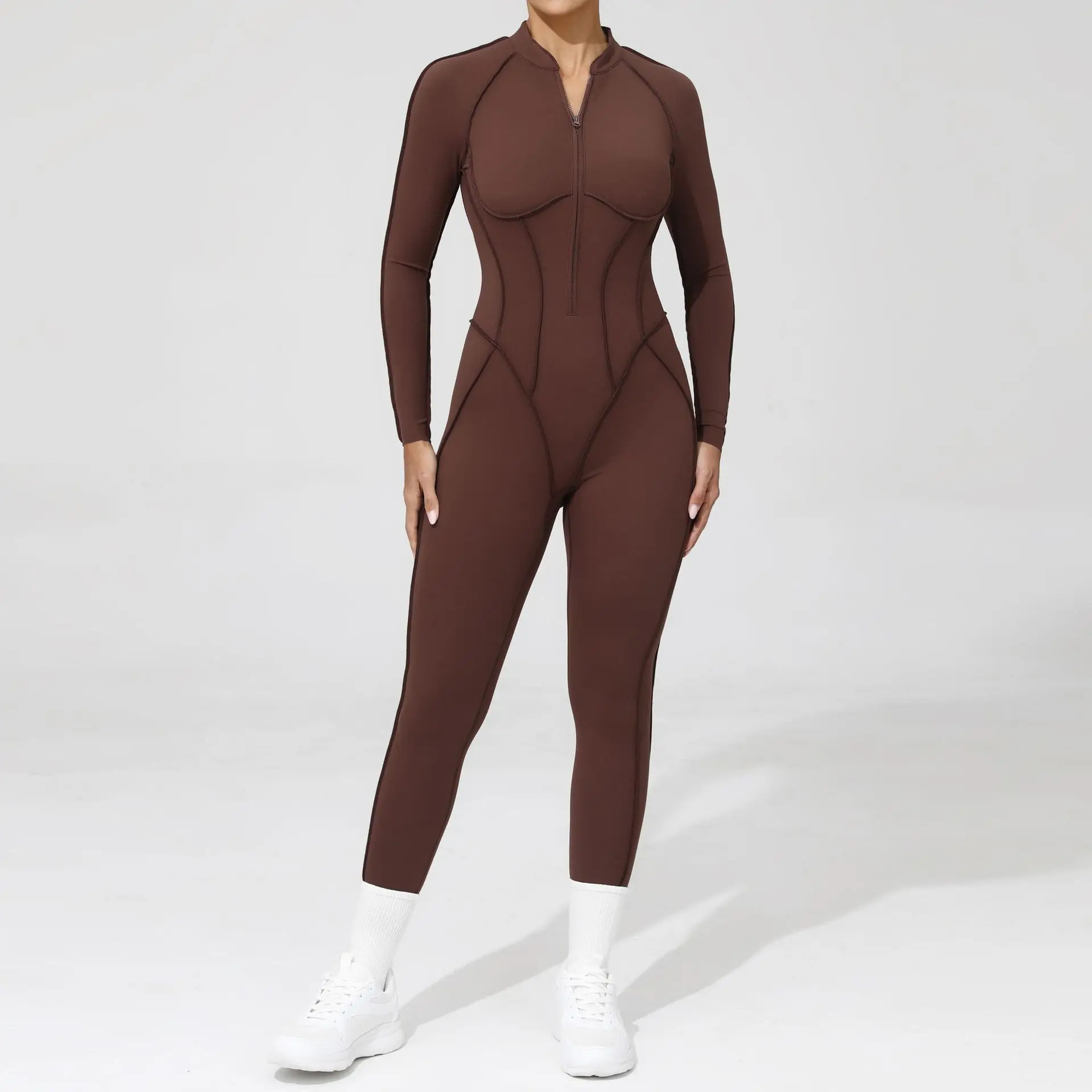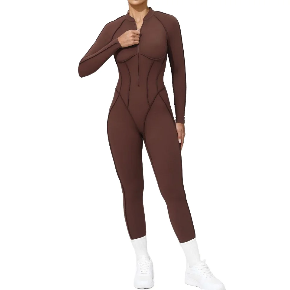 Womens Quick Dry Open Back Bodysuit Elastic Long Compression Yoga Jumpsuit with Front Zipper Sports Bodysuits & Jumpsuits