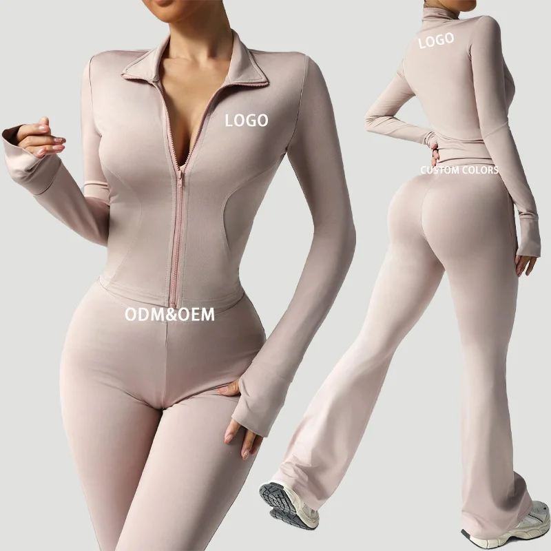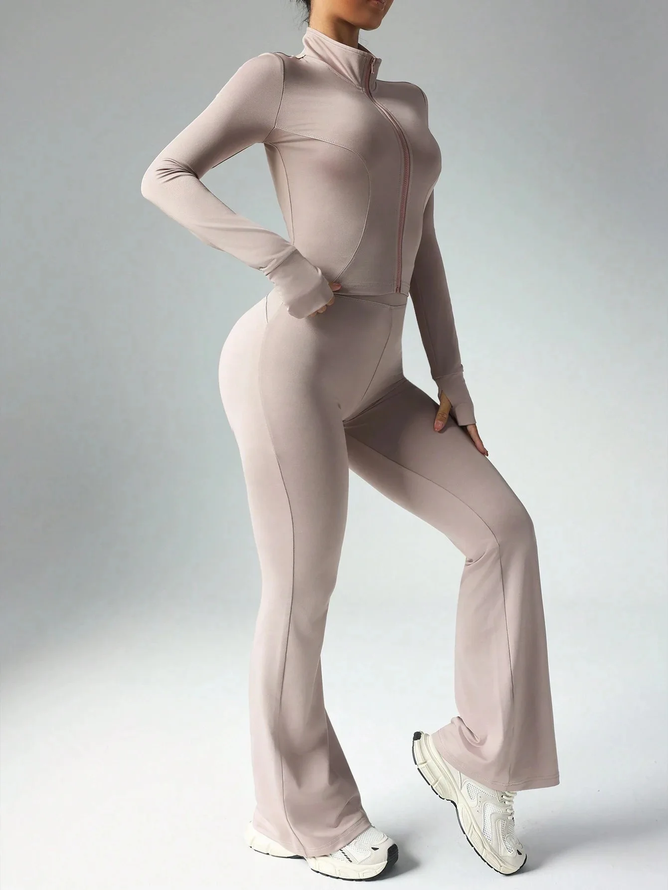 Solid-color Long-sleeved Zipper Sportswear Set High-waisted Slightly Flared Fitness Pants Quick-drying Nude Yoga Wear Set