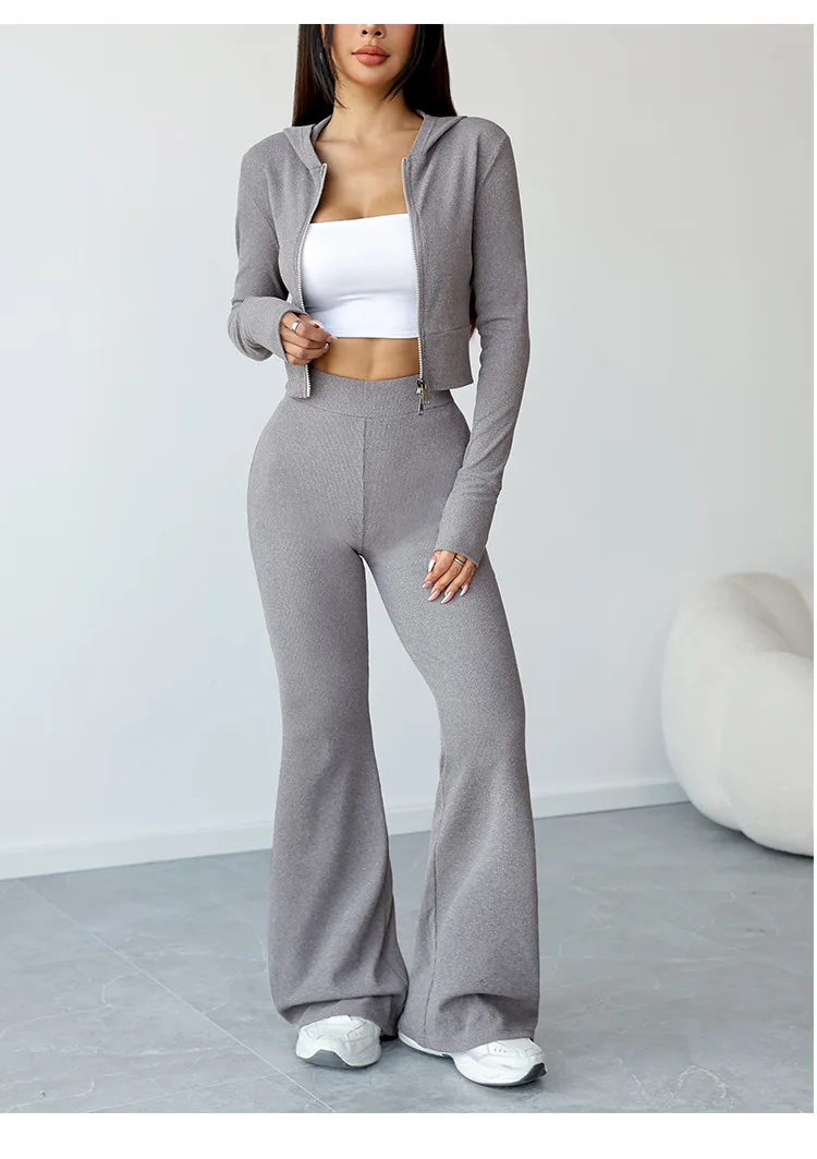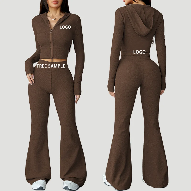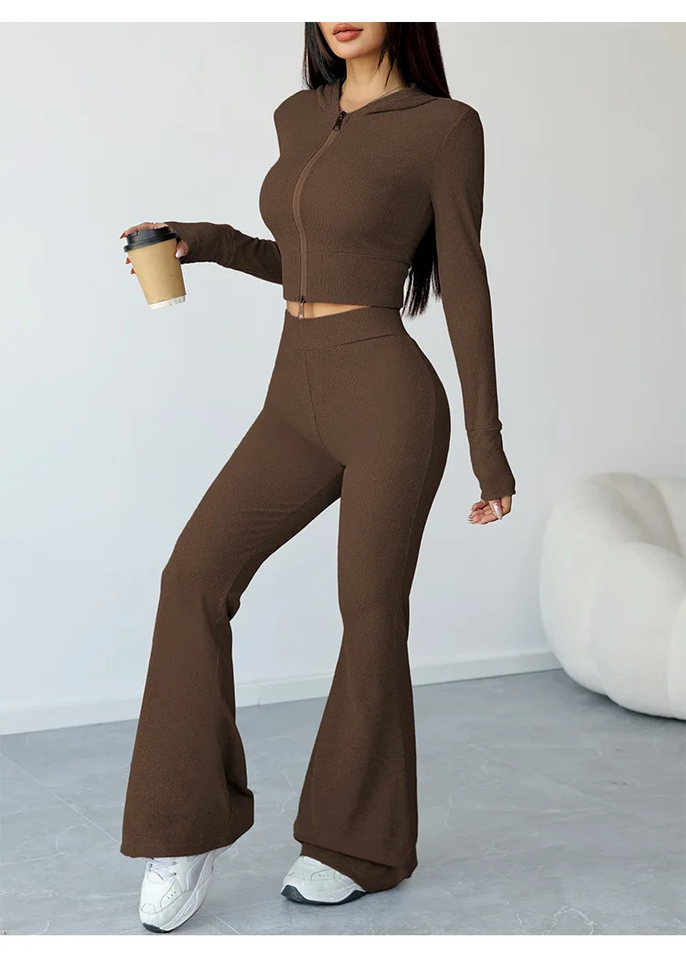 New Eco-Friendly Lightweight 2-Piece Yoga Wear Set for Women Featuring a Hooded Zipper Top and Flared Pants