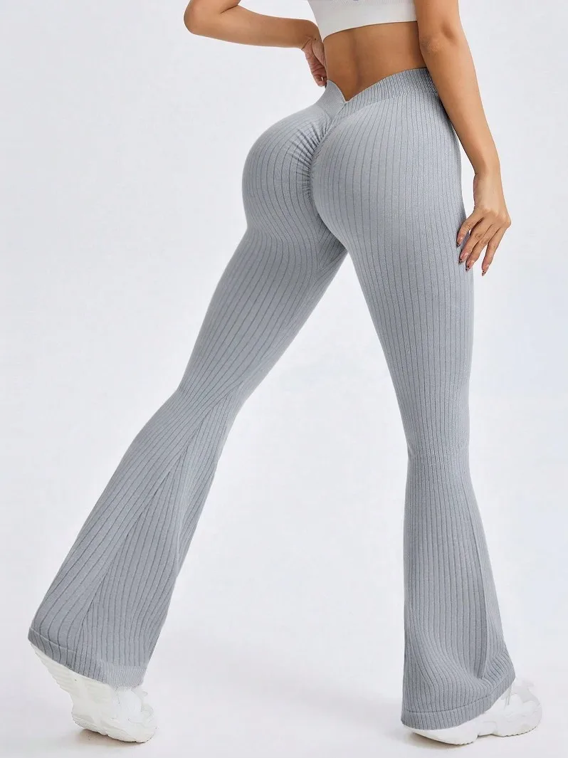 Hot Selling Custom Logo Ribbed Material Breathable Unique V Back Design Yoga Wear Bottom Flare Legging for Women