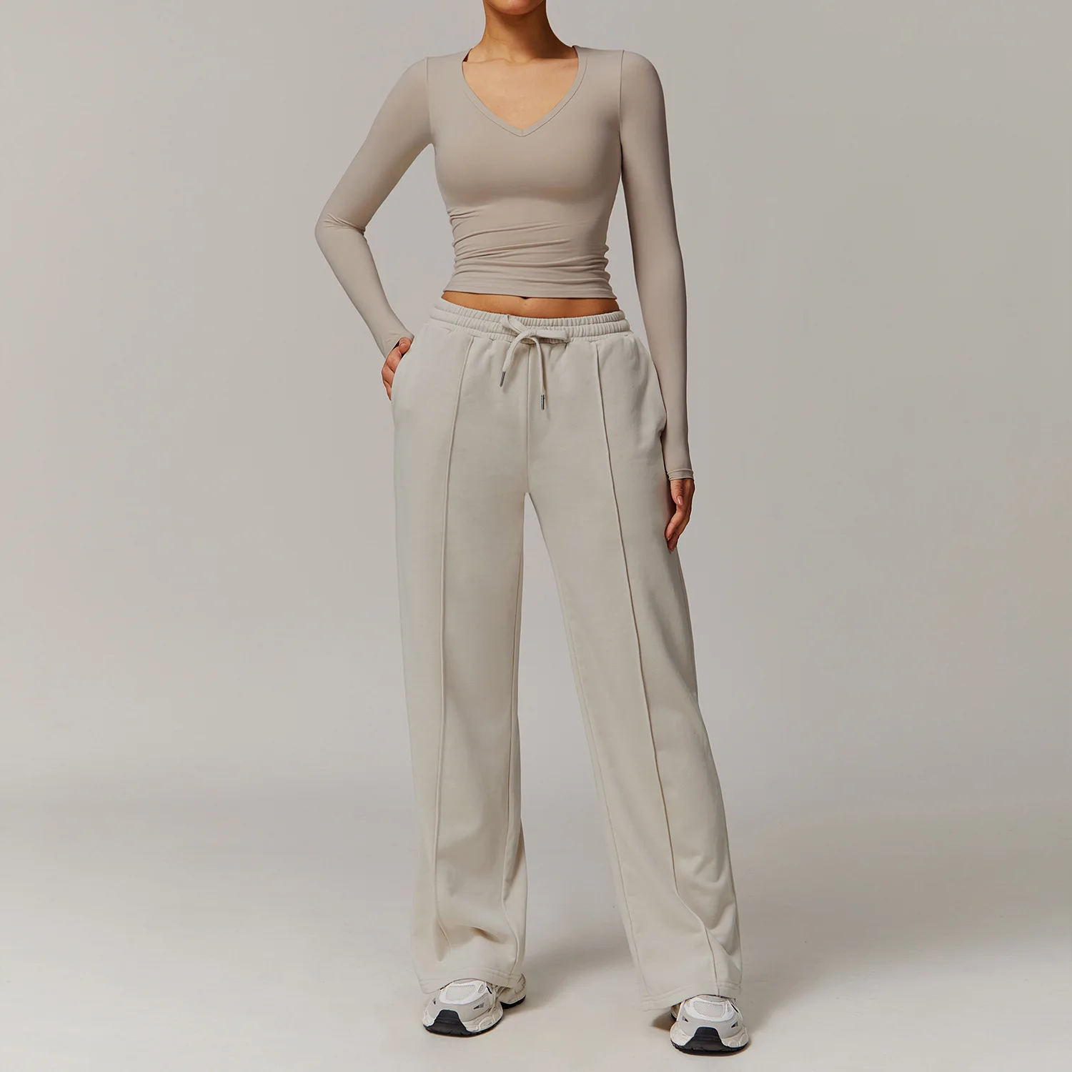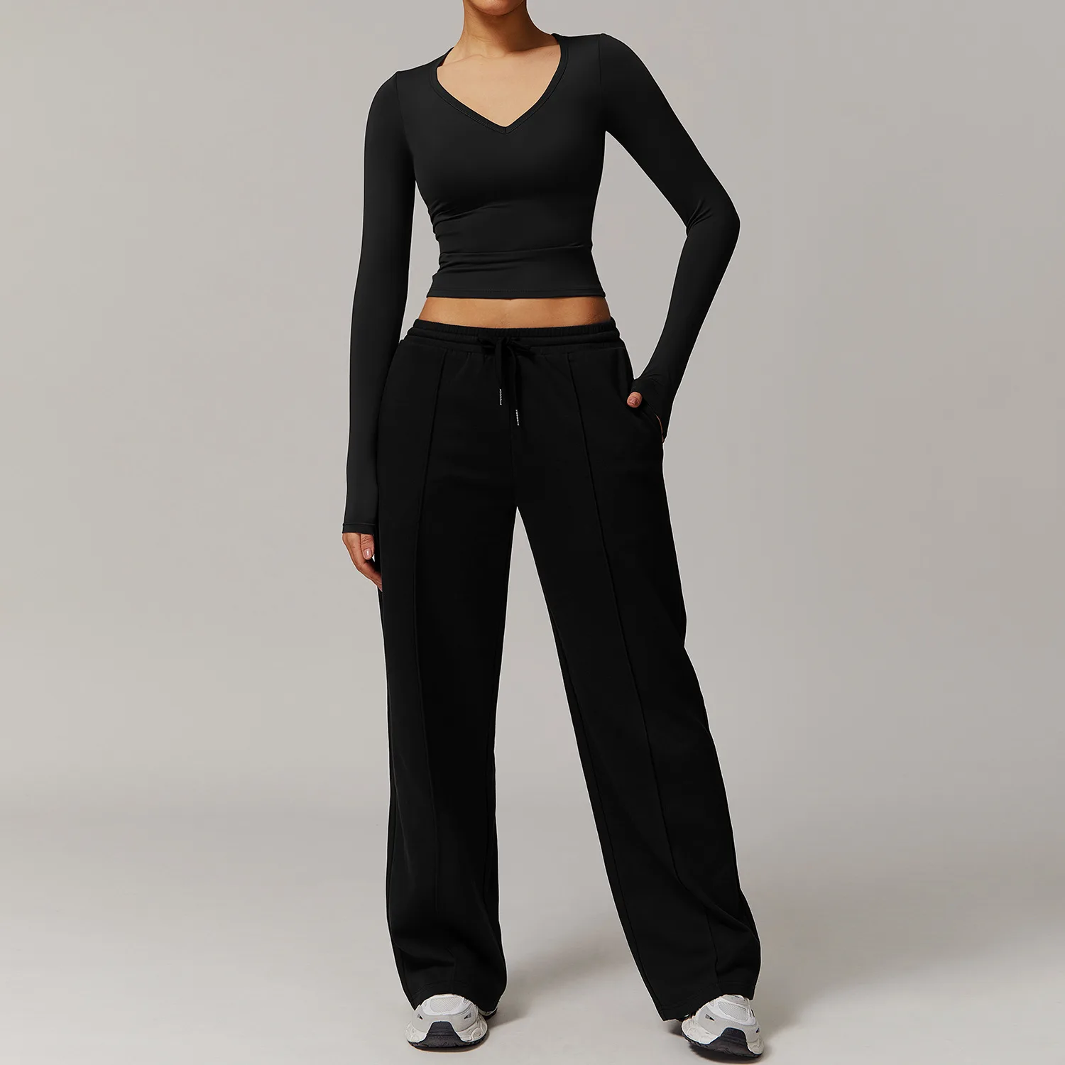 Autumn and Winter Brushed Long-Sleeve Yoga Set - High-Waisted Slim-Fit Wide-Leg Sweatpants Fitness Sportswear for Women