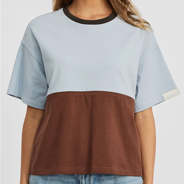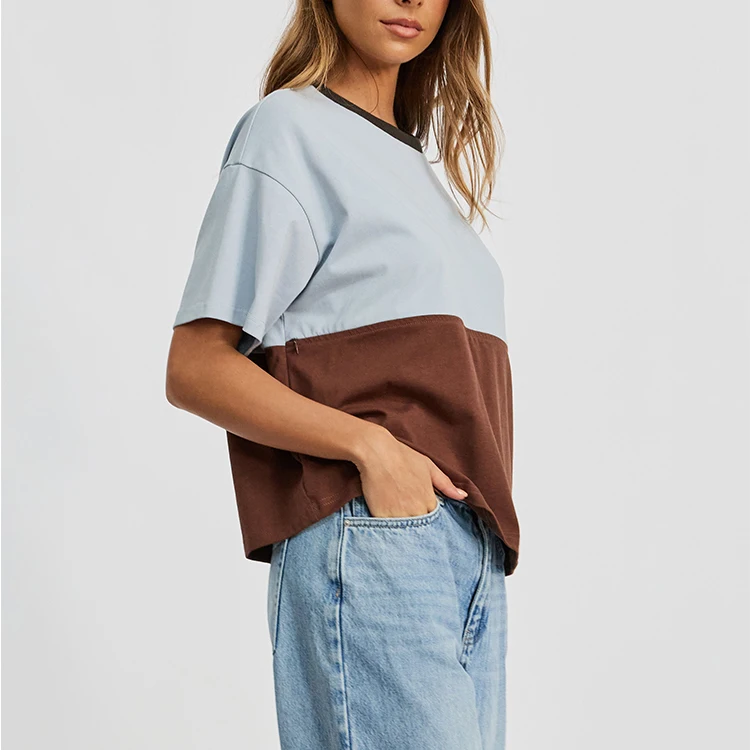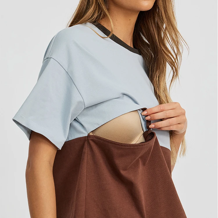 Drop Shoulder Nursing Tee - Brown & Baby Blue Mixed Color Block Breastfeeding Shirt