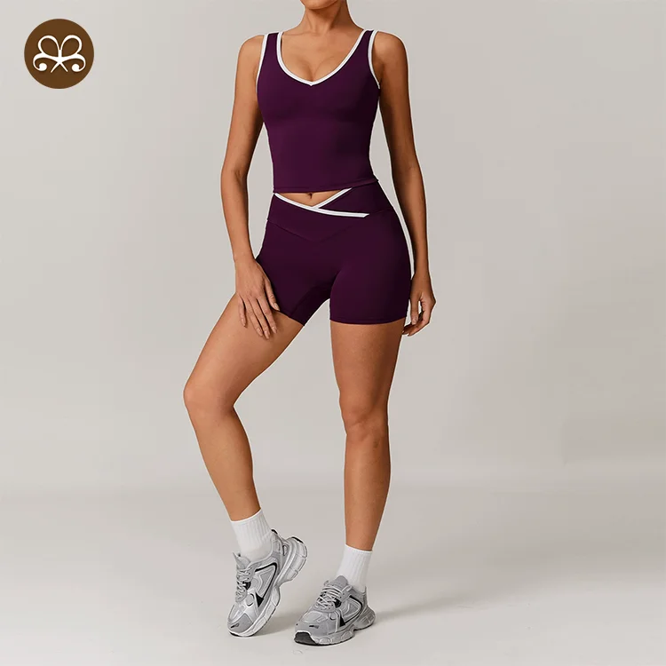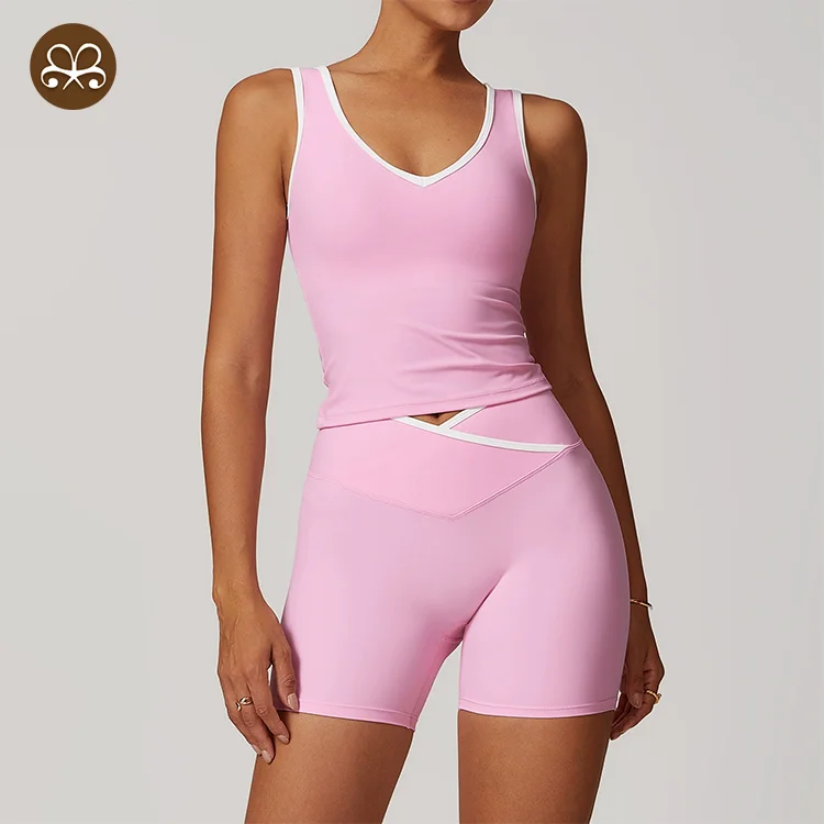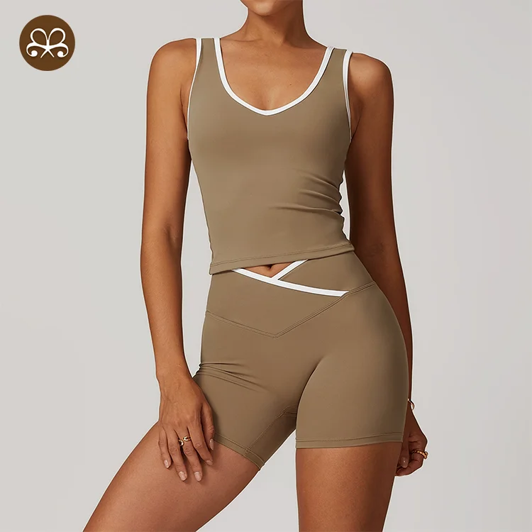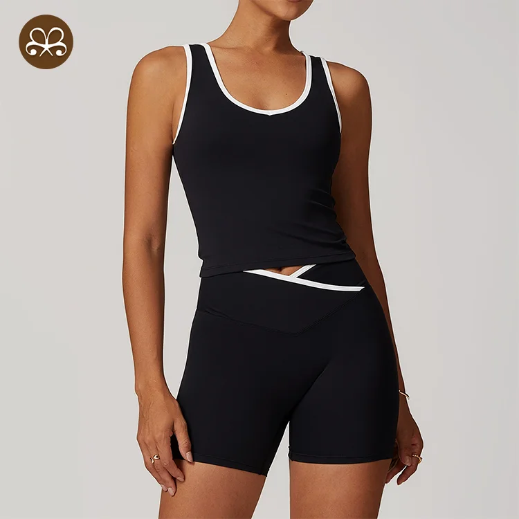 Custom Fitness Top Color Contrast Sleeveless Gym Sports Bra Workout Shorts Wear Shockproof Women's 2pcs Yoga Set