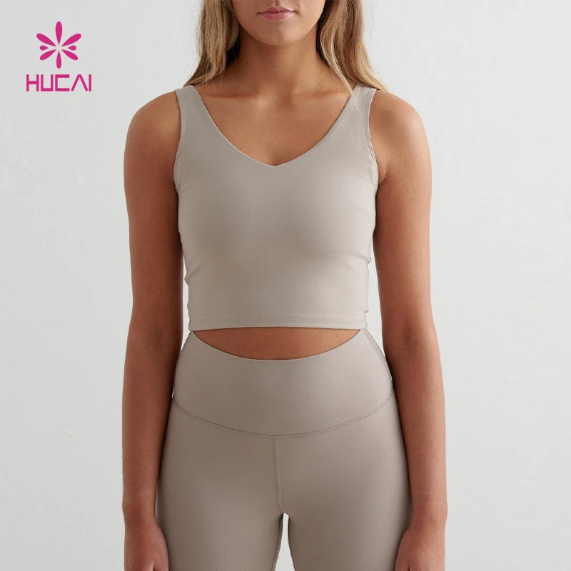 HUCAI Custom V-shape Back V Neck Removable Pads Fully Lined High Impact Workout Running Crop tank Top Sports Bra