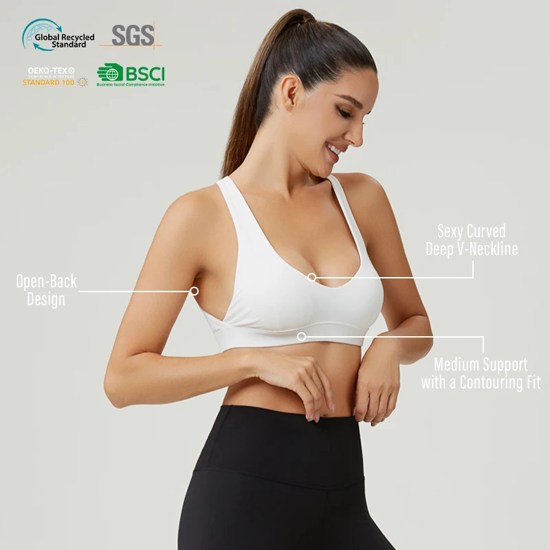 HUCAI Custom 75%Nylon 25%Spandex Peach-soft Medium Support Deep V-Neck Line Open-Back Women Sports Bra