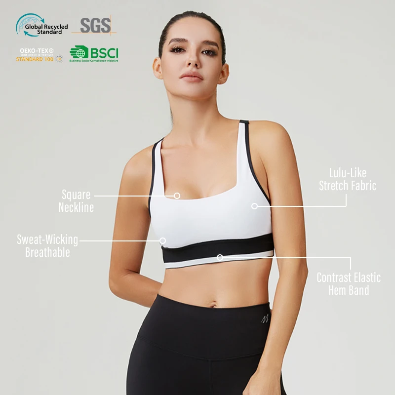 HUCAI Custom 73% Polyester 27% Spandex High Support Stretch Contrast Elastic Hem Band Square Neckline Sports Bra