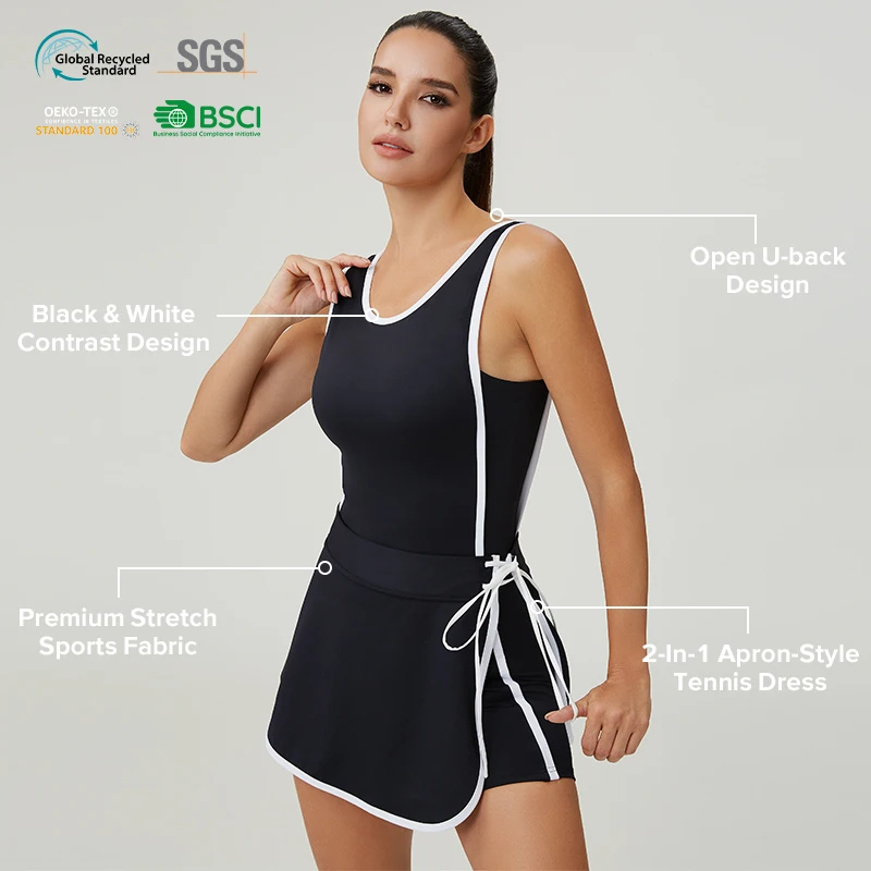 HUCAI Custom New Design Fashionable Sports Wear Open U-back Womens 2-in-1 Apron-style Bodysuit Tennis Dress With Skirts