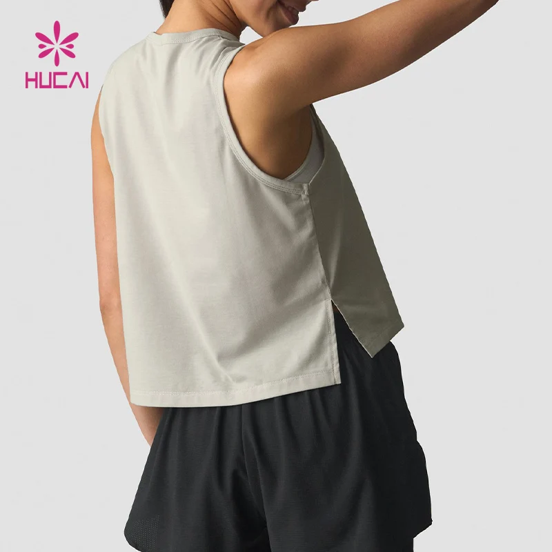 HUCAI OEM Custom logo Lightweight Split Hem Sweat-wicking Loose Fit Gym Cropped Running Singlet Training tank Top Women