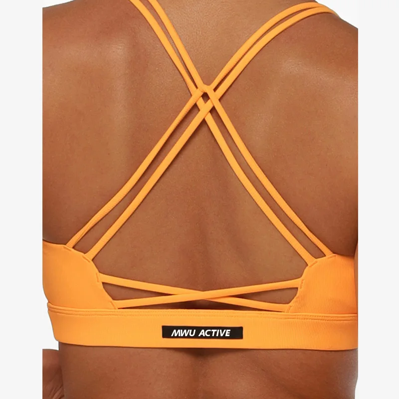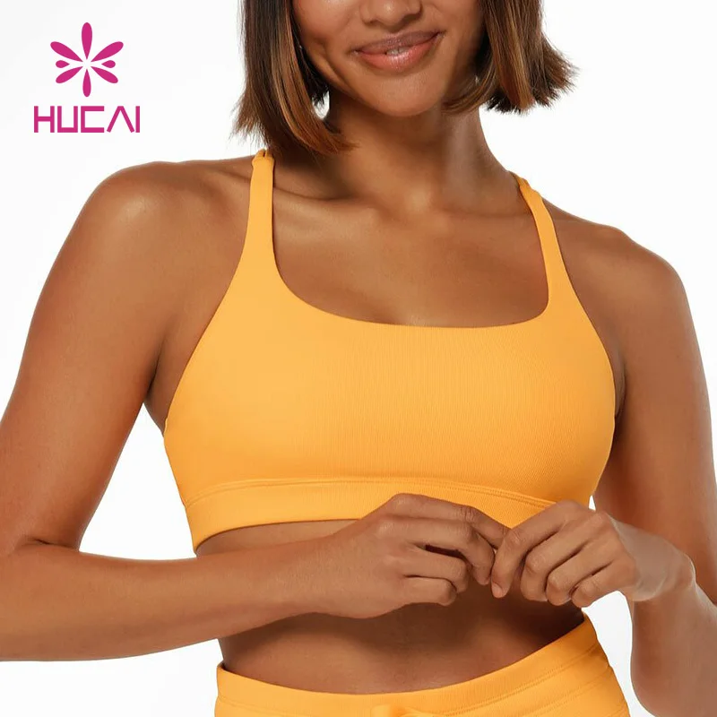 Custom logo 68% Nylon / 32% Spandex 4 Way Stretch Flex Rib Yellow Removable Padding Cross Back Strappy Yoga Sports Bra