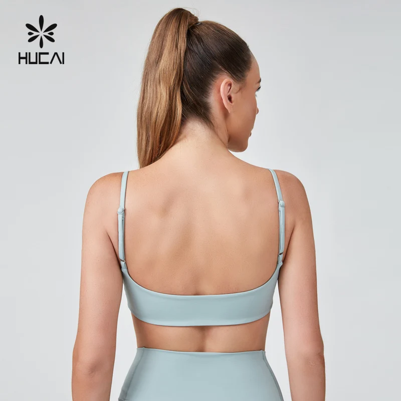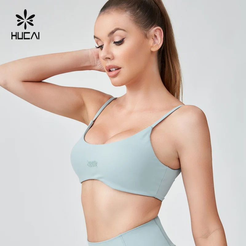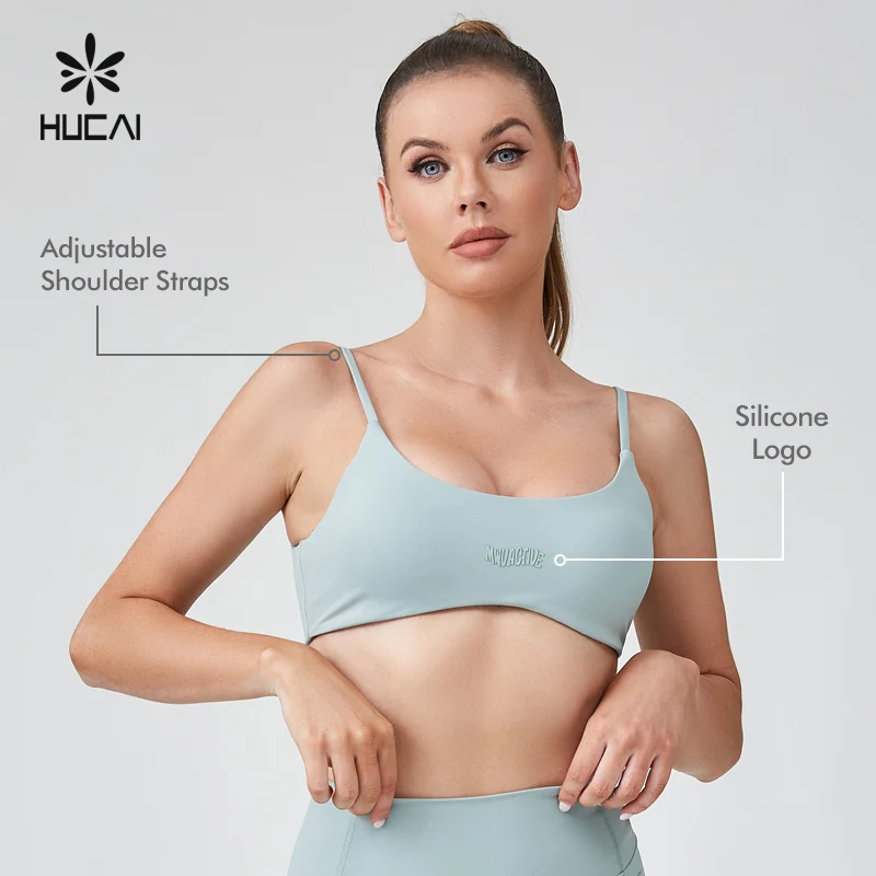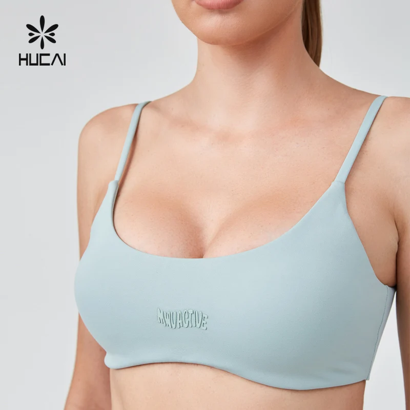 HUCAI Custom Polyester Spandex Sexy Adjustable Spaghetti Strap 3D Silicone logo Printed Yoga Sports Bra for Women
