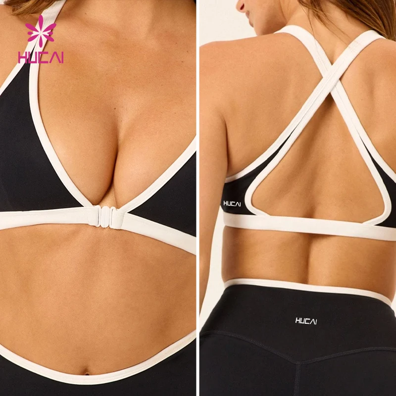 HUCAI Custom Spandex Front Clasp Plunge V Neckline Removable Padding Contrasting Stripes Cross Back Yoga Gym Sports Bra Women