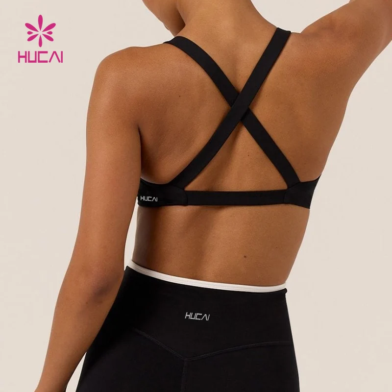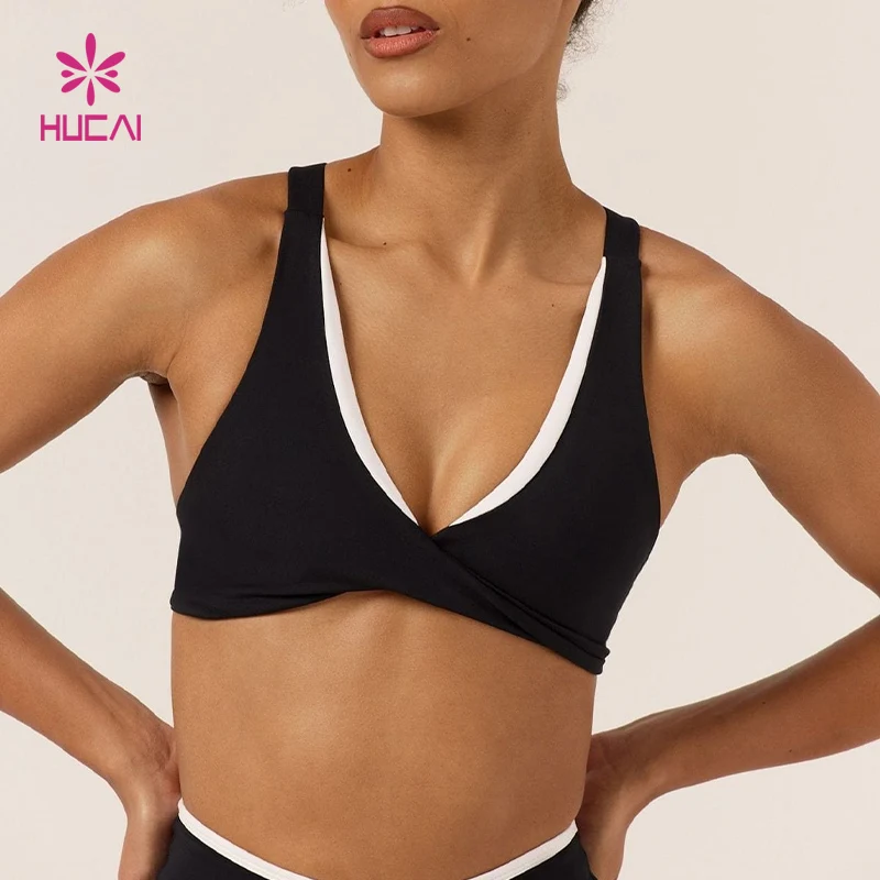 HUCAI Custom Nylon V Neckline Two Tone Contrast Color Double Lined Cross Back Twist Yoga Fitness Sports Bra for Women