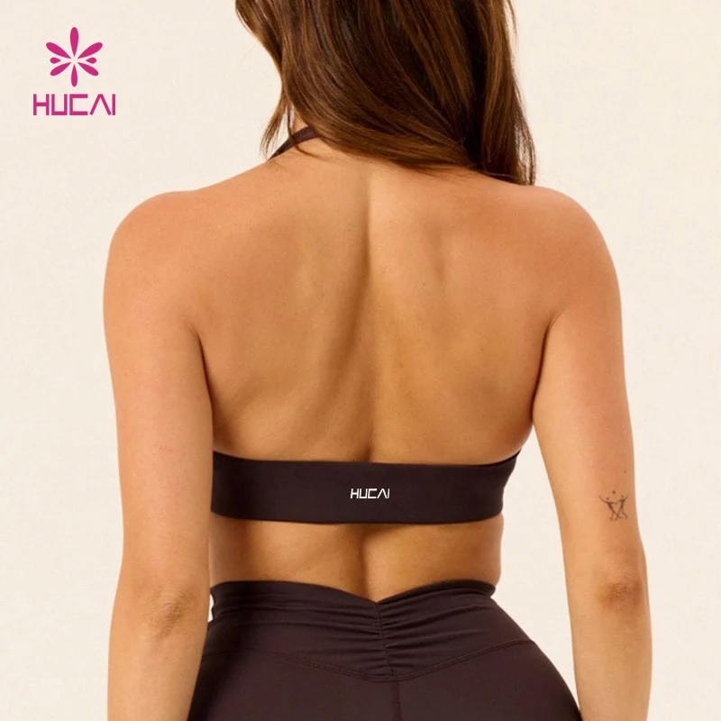 HUCAI Premium Custom Nylon Scoop Neck Front Backless Fitness Halter Wrinkle Sports Yoga Bra for Women