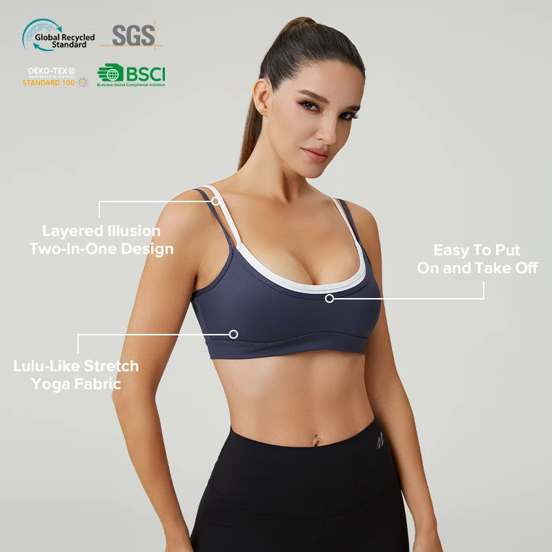HUCAI Custom Logo 75%nylon 25%spandex Stretch Yoga High Quality Layered Two-in-one Design Double Layer Sports Bra