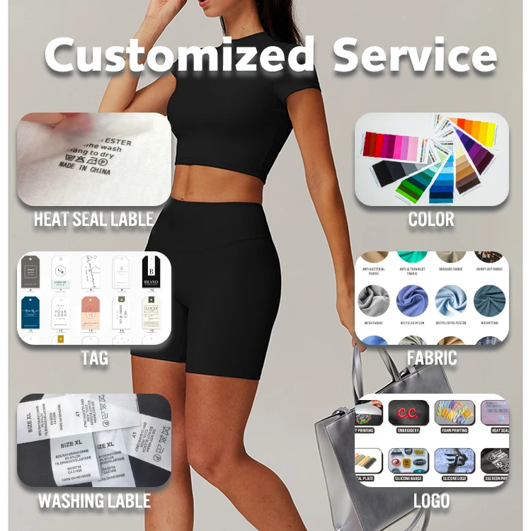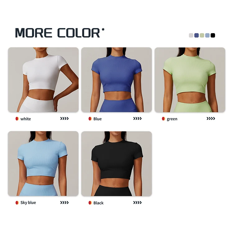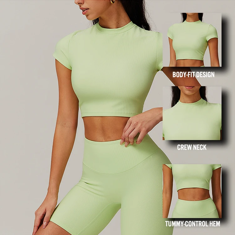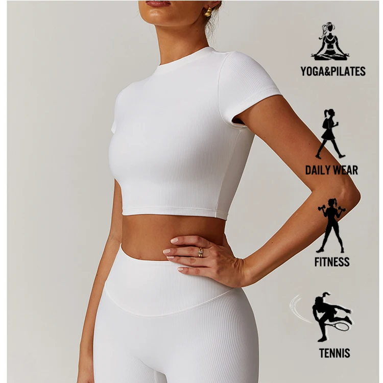 Custom Ribbed Fabric Solid Color Women Short Sleeve Yoga Top Outdoor Training Workout Running Gym Sports Shirt Yoga Top