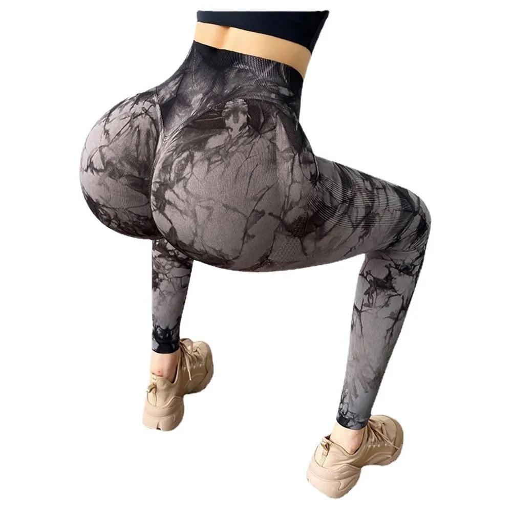 Women's High Waist Seamless Yoga Fitness Pants Tie-Dye Design Autumn Winter Cropped Jacquard Running Pant Peach Elastic Waist