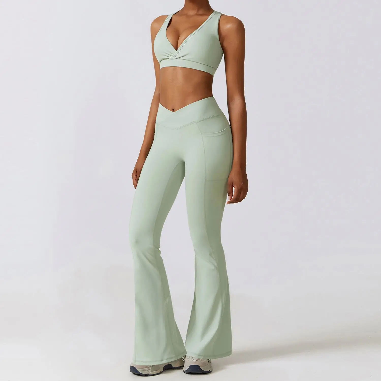 YISHENHON High Quality Gym Yoga Flare Leggings Hot Selling High-Waisted Wide Leg Pants for Women Solid Casual Sport Running