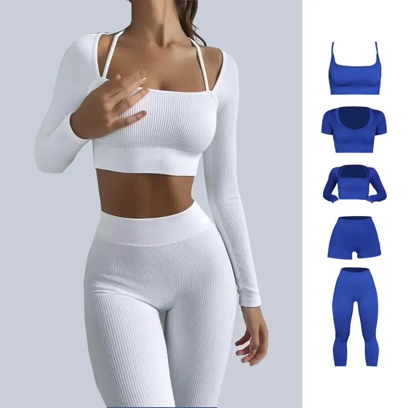 Fitness Running Athletic Yoga Suits 5Pcs Short Women'S Yoga Jacket Leggings Set Woman Long Sleeve Yoga Pant Set