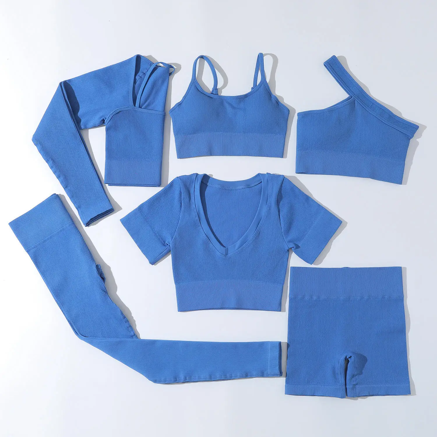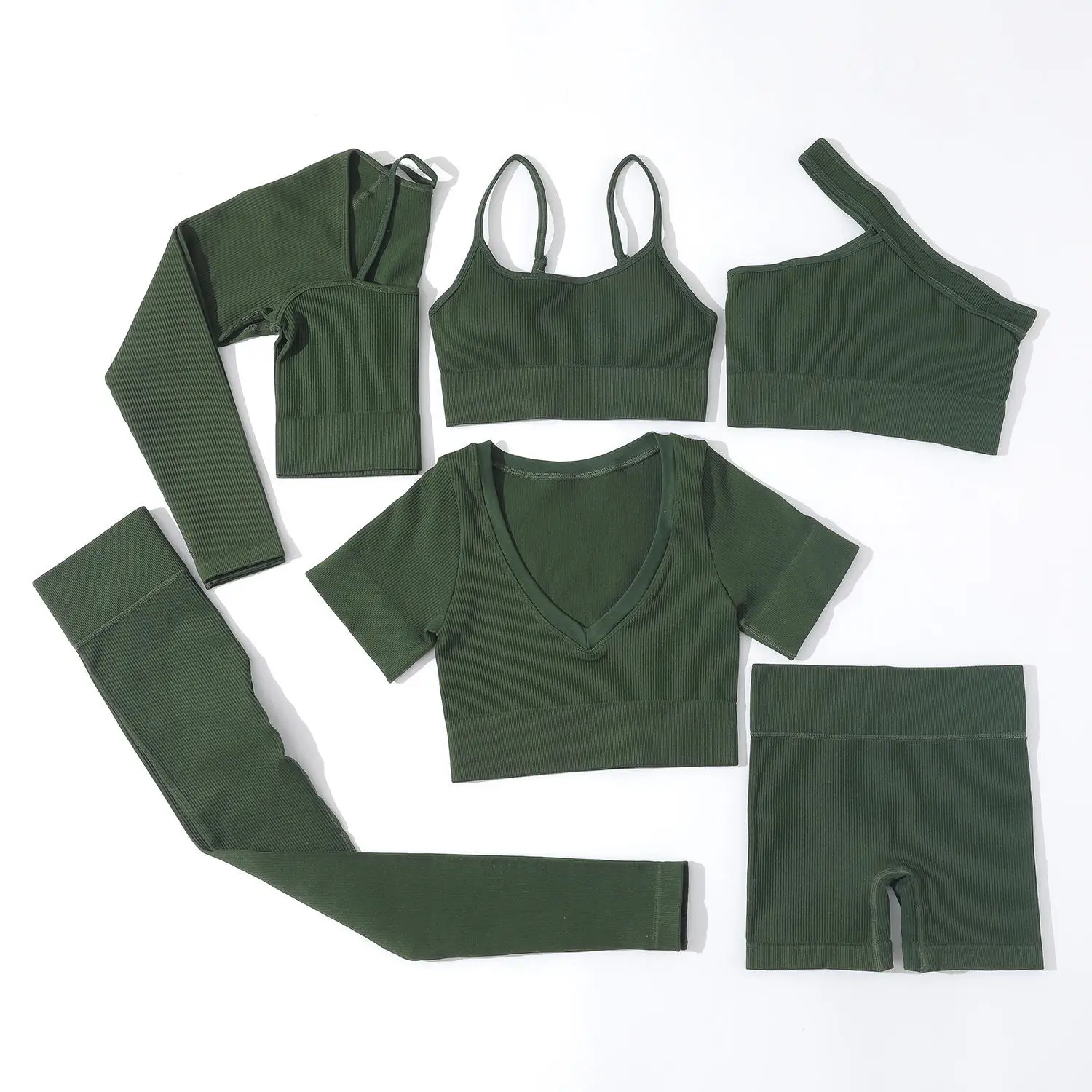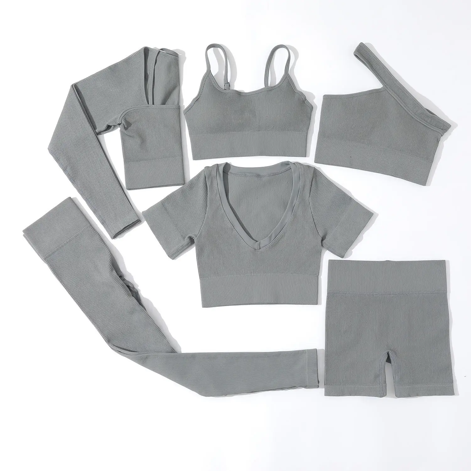 YISHENHON Women's Fitness Activewear Set 5pcs Seamless Yoga Leggings & Bras with Long Sleeve Gym Tops Solid Pattern Sport Outfit