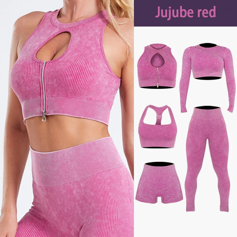 YISHENHON Women's Fitness Activewear Set 5pcs Seamless Yoga Leggings & Bras with Long Sleeve Gym Tops Solid Pattern Sport Outfit